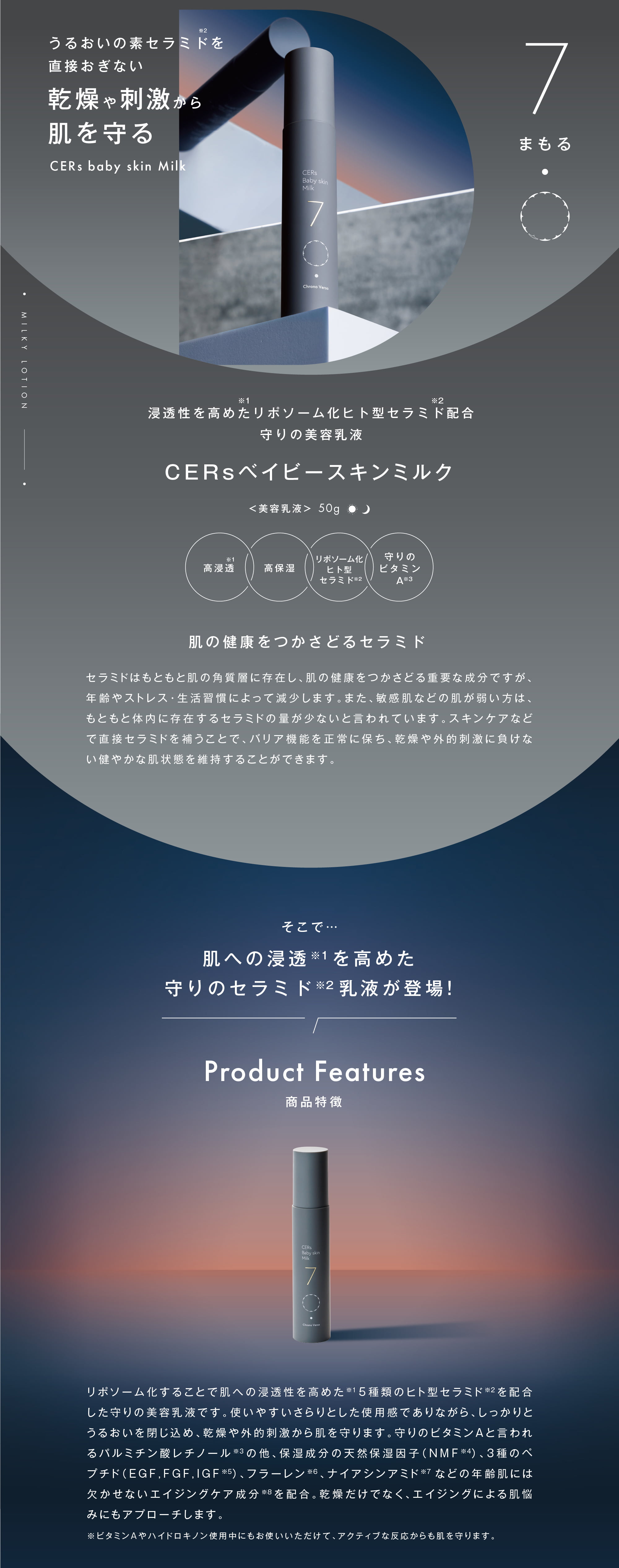 特徴 リポソーム化することで肌への浸透性を高めた※1 5種類のヒト型セラミド※2を配合した守りの美容乳液です。