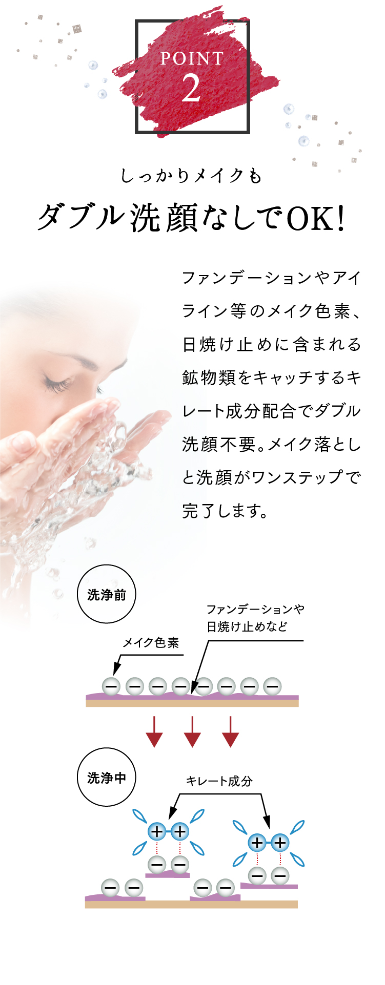 メイク落とし+洗顔が1本で完了 メイク用品や日焼け止めに含まれる鉱物類をキャッチする成分 **テトラヒドロキシプロピルエチレンジアミン(※1)**を配合。 W洗顔不要で、肌負担を軽減します。