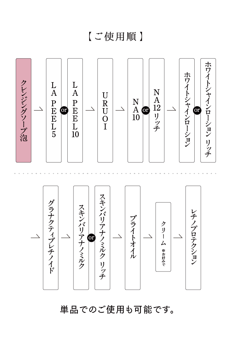 成分 水、グリセリン、カリ石ケン素地、ヤシ脂肪酸アルギニン、ラウリルヒドロキシスルタイン、セラミドNG、BG、コカミドDEA、PEG/PPG/ポリブチレングリコール-8/5/3グリセリン、オレンジ油、キダチアロエ葉エキス、サボンソウ葉エキス、テトラヒドロキシプロピルエチレンジアミン、ヒアルロン酸Na、水酸化K、PPG-4セテス-20、DPG、フェノキシエタノール