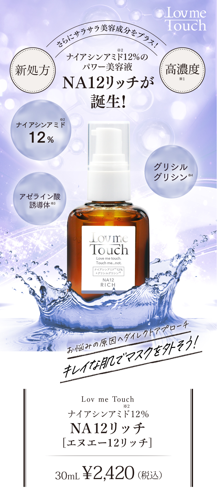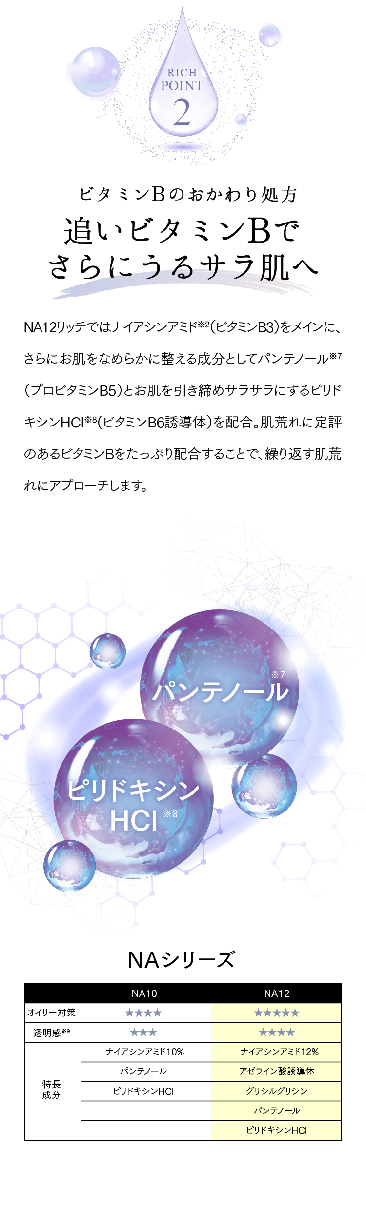 特徴 毛穴ケア・オイリー肌向け成分として大注目の「ナイアシンアミド(※1)」を高濃度12%配合。さらに「アゼライン酸誘導体(※2)」や「グリシルグリシン(※3)」などのサポート成分配合で、過剰な皮脂分必による肌トラブルやテカリにアプローチし、なめらかでクリアな印象のお肌に導きます。