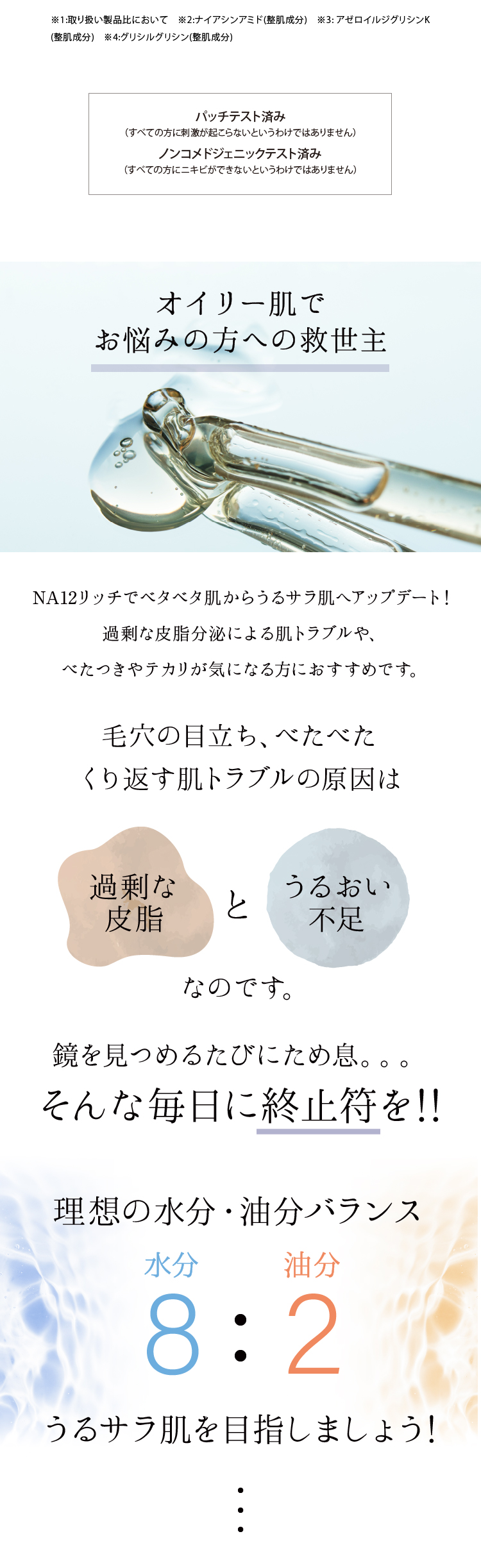 ナイアシンアミド12%配合(※1) 毛穴ケア・オイリー肌向け成分として注目のナイアシンアミドを高配合。 皮脂バランスを整え、キメの整ったなめらかな肌印象へ。