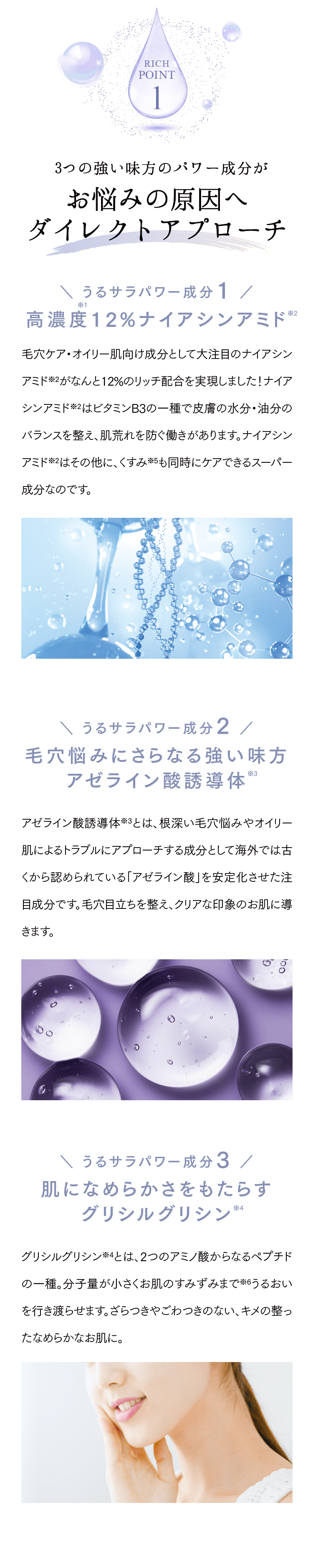 皮脂トラブルを多角的にサポート ・アゼライン酸誘導体(※2):過剰な皮脂分泌や肌荒れにアプローチ ・グリシルグリシン(※3):毛穴の目立ちにくい、すっきりとした肌印象をサポート