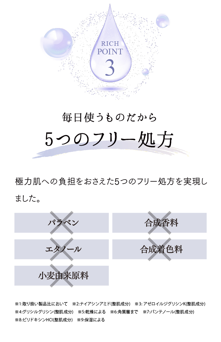 ※1 ナイアシンアミド(整肌成分) ※2 アゼロイルジグリシンK(整肌成分) ※3 グリシルグリシン(整肌成分)