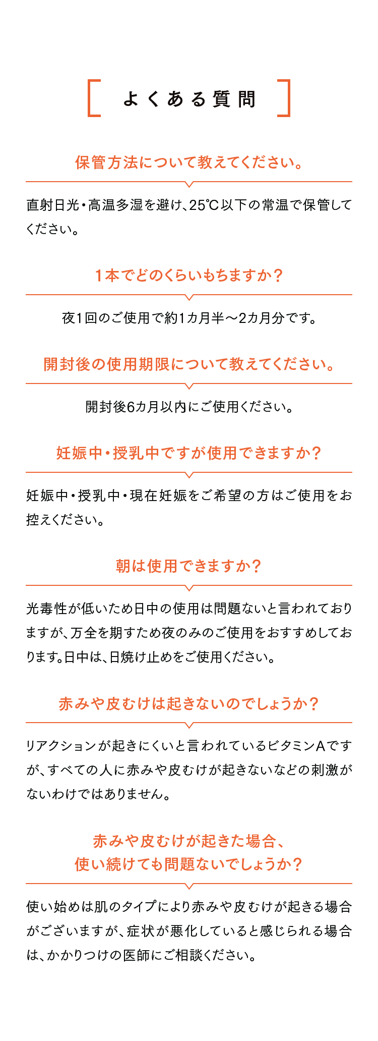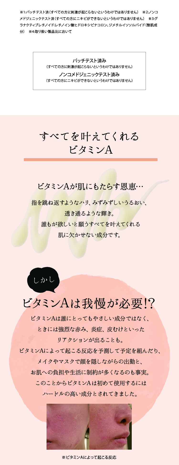 ご使用上の注意 ※こちらの商品は高濃度のビタミンAが配合されているため、お客様へのご販売に際しまして、カウンセリングを行い、お客様に適切な使用方法や注意事項をお伝えしてください。