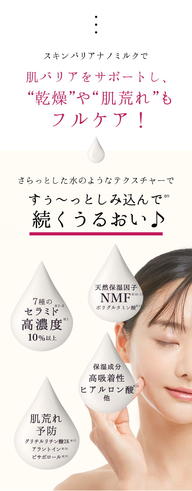 特徴 肌になじむ高濃度(※1)セラミドウォーター乳液。スポンジのように水分を抱え込んで、はなさない『うるおい肌』へ導きます。 す?っとしみこむサラっとしたテクスチャーです。