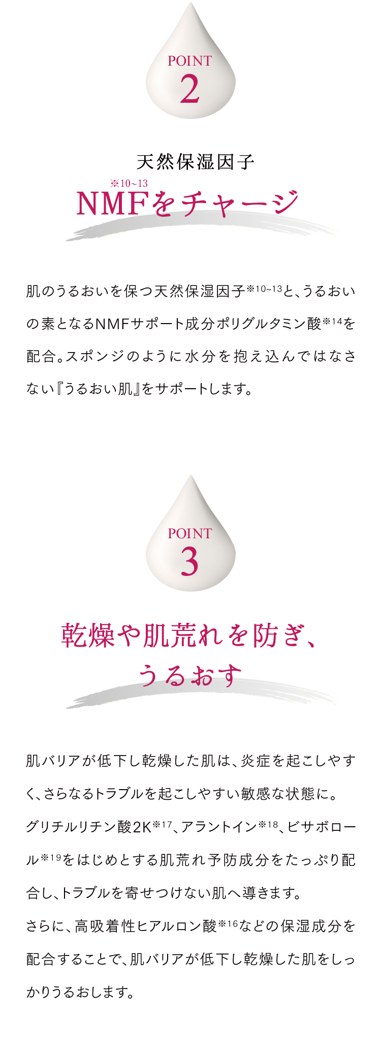 成分 水、ラウロイルグルタミン酸ジ(フィトステリル/オクチルドデシル)、ジグリセリン、BG、DPG、ペンチレングリコール、プロパンジオール、水添レシチン、ヘキシルデカノール、セラミドNG、セラミドAP、セラミドNP、フィトスフィンゴシン、セチルヒドロキシプロリンパルミタミド、ステアリン酸、アブラナステロールズ、PCA?Na、PCA、乳酸Na、ポリグルタミン酸、ヒドロキシエチルウレア、ジラウロイルグルタミン酸リシンNa、プロリン、グリシン、アラニン、セリン、バリン、フェニルアラニン、ヒスチジン、アルギニン、アスパラギン酸、イソロイシン、トレオニン、アラントイン、グリチルリチン酸2K、ビサボロール、ベタイン、水溶性プロテオグリカン、ヒアルロン酸ヒドロキシプロピルトリモニウム、アセチルヒアルロン酸Na、サクシノイルアテロコラーゲン、ポリクオタニウム?51、トコフェリルリン酸Na、パンテノール、ブドウ果実エキス、トコフェロール、異性化糖、ジメチコン、ベヘニルアルコール、ペンタヒドロキシステアリン酸ポリグリセリル?10、ラウリン酸ポリグリセリル?10、ステアロイルラクチレートNa、クエン酸、マンダリンオレンジ果皮エキス、フェノキシエタノール