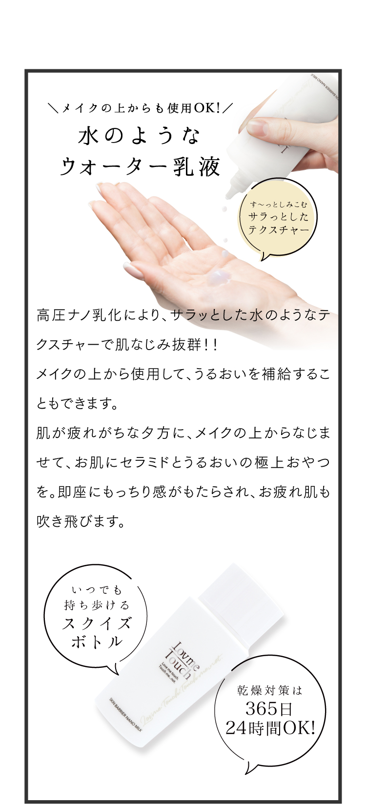 Lov me Touch スキンバリアナノミルク(50mL)は、肌のバリア機能に着目して開発された高濃度セラミド配合※のセラミドウォーター乳液です。 ナノ化されたセラミドが角質層まで素早くなじみ、スポンジのように水分を抱え込んで逃がさず、長時間うるおいをキープします。 みずみずしくサラッとしたテクスチャーでベタつきにくく、肌にすっと浸透。乾燥やゆらぎを感じやすい肌をやさしく包み込み、しっとりとなめらかな“うるおい肌”へ導きます。 季節の変わり目や乾燥対策、スキンケアの仕上げにも取り入れやすい一本です。 ※取り扱い製品比において