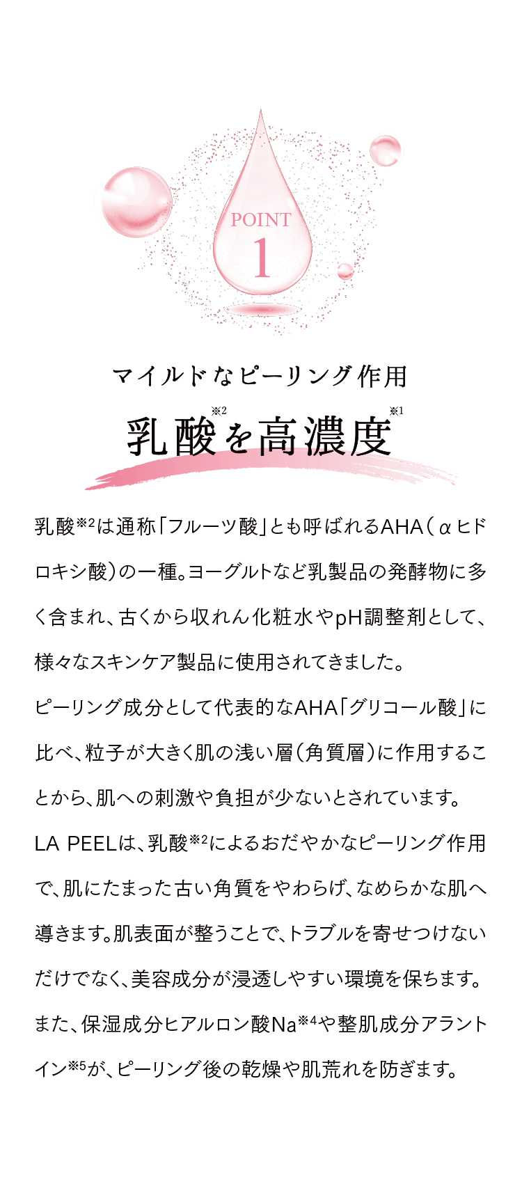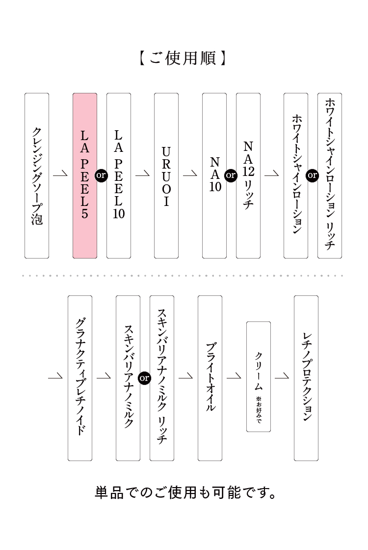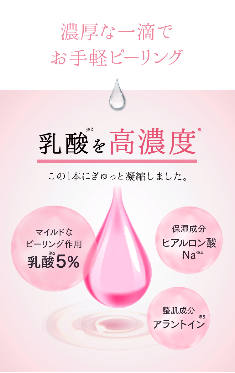 特徴 フルーツ酸AHAの一種である乳酸を5%配合した洗い流すタイプのピーリングローション。天然着色料を使用した色つき美容液で、洗い残しを防ぎます。乳酸の穏やかなピーリング作用により、肌トラブルのもととなる古い角質をやさしくやわらげ、滑らかな肌へ整えます。また保湿成分ヒアルロン酸、整肌成分アラントインがピーリング後にありがちな乾燥や肌荒れを防ぎます。