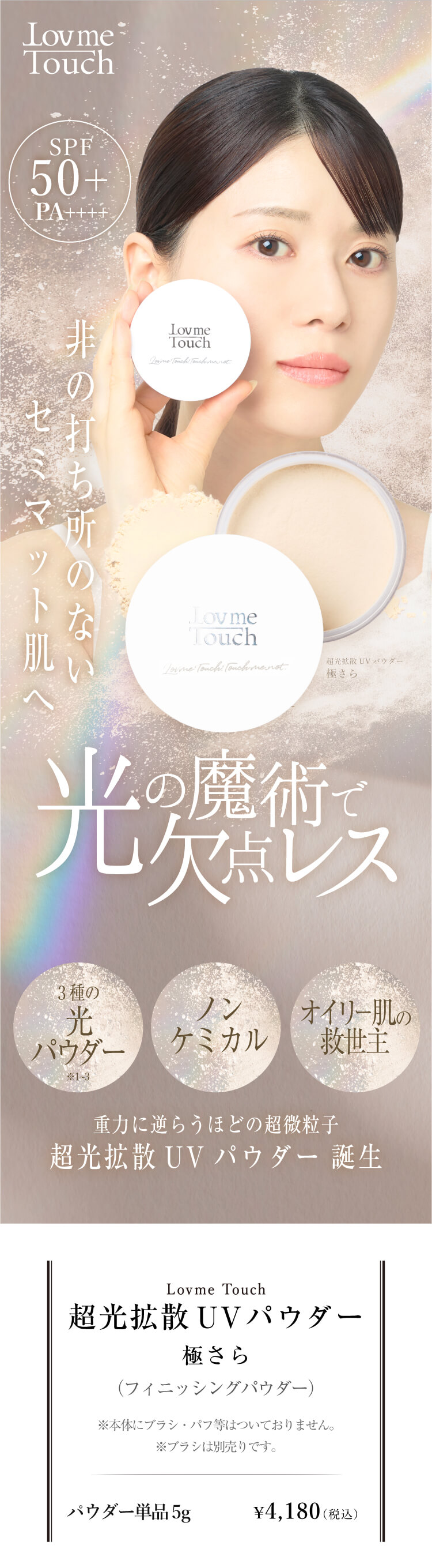 Lov me Touch(ラブミータッチ)超光拡散UVパウダー 極さら SPF50+ PA++++は、メイクの仕上がりと紫外線対策を同時に叶える高機能フィニッシングパウダーです。 独自の超光拡散テクノロジーにより、毛穴や色ムラなどの肌悩みを自然にぼかし、厚塗り感のない欠点レスなセミマット肌へ導きます。
