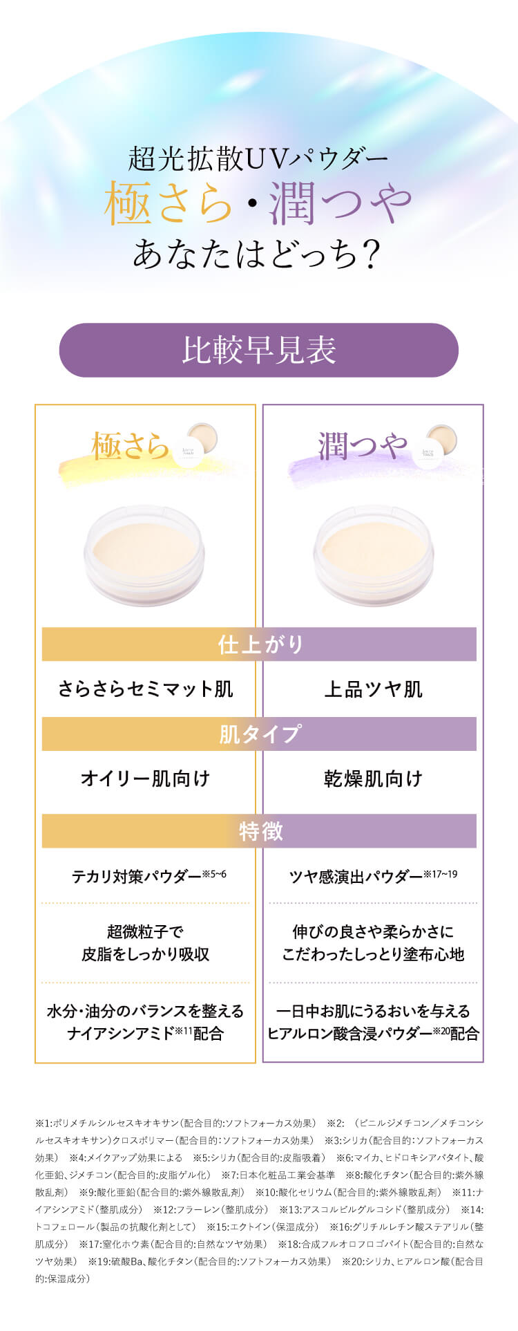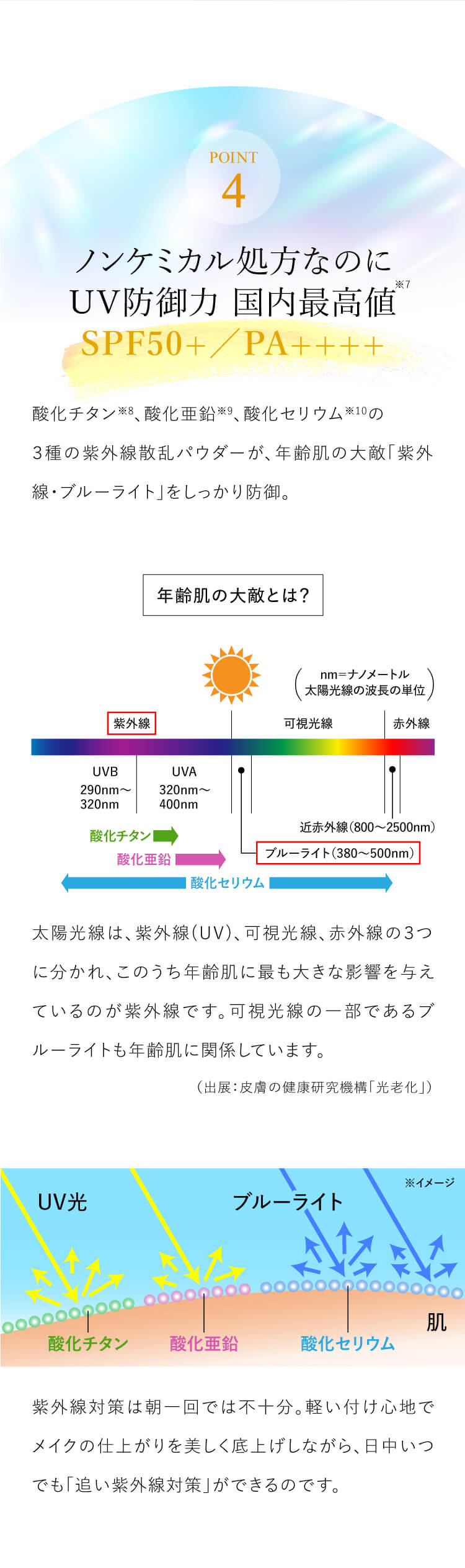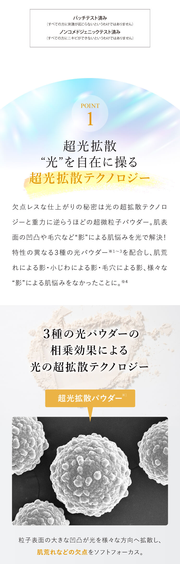 特徴 超光拡散テクノロジーで、欠点レスなセミマット肌へ導くフィニッシングパウダー。 欠点レスな仕上がり、皮脂対策、豊富な美容成分、ノンケミカル処方と、高い紫外線防御力(SPF50+ PA++++)すべてを兼ね備えるパウダーが実現しました。