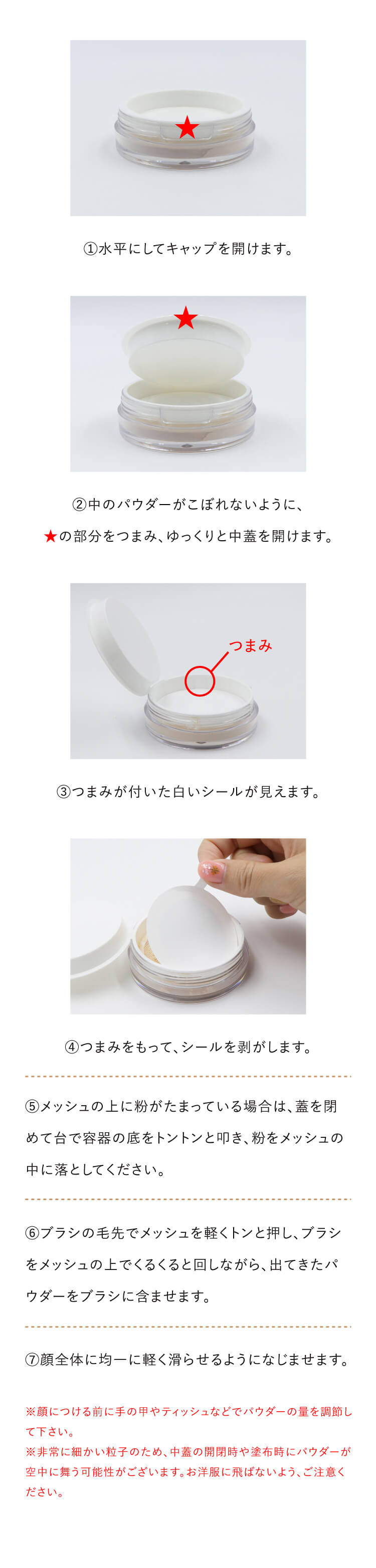 ご使用上の注意 1.ご使用後はキャップと中蓋をしっかりと閉めて下さい。粉漏れの可能性がありますので、保管時は必ず水平に置くようにして下さい。ブラシはいつも清潔にしてお使い下さい。 2.お肌に異常が生じていないかよく注意して使用してください。化粧品がお肌に合わないとき即ち次のような場合には、使用を中止してください。そのまま化粧品類の使用を続けますと、症状を悪化させることがありますので、皮膚科専門医等にご相談されることをおすすめします。 (1)使用中、赤味、はれ、かゆみ、刺激、色抜け(白斑等)や黒ずみ等の異常があらわれた場合 (2)使用したお肌に、直接日光があたって上記のような異常があらわれた場合 3. 傷やはれもの、しっしん等、異常のある部位にはお使いにならないでください。 4. 目に入らないようご注意ください。目に入った場合はこすらず、すぐに水で洗い流してください。