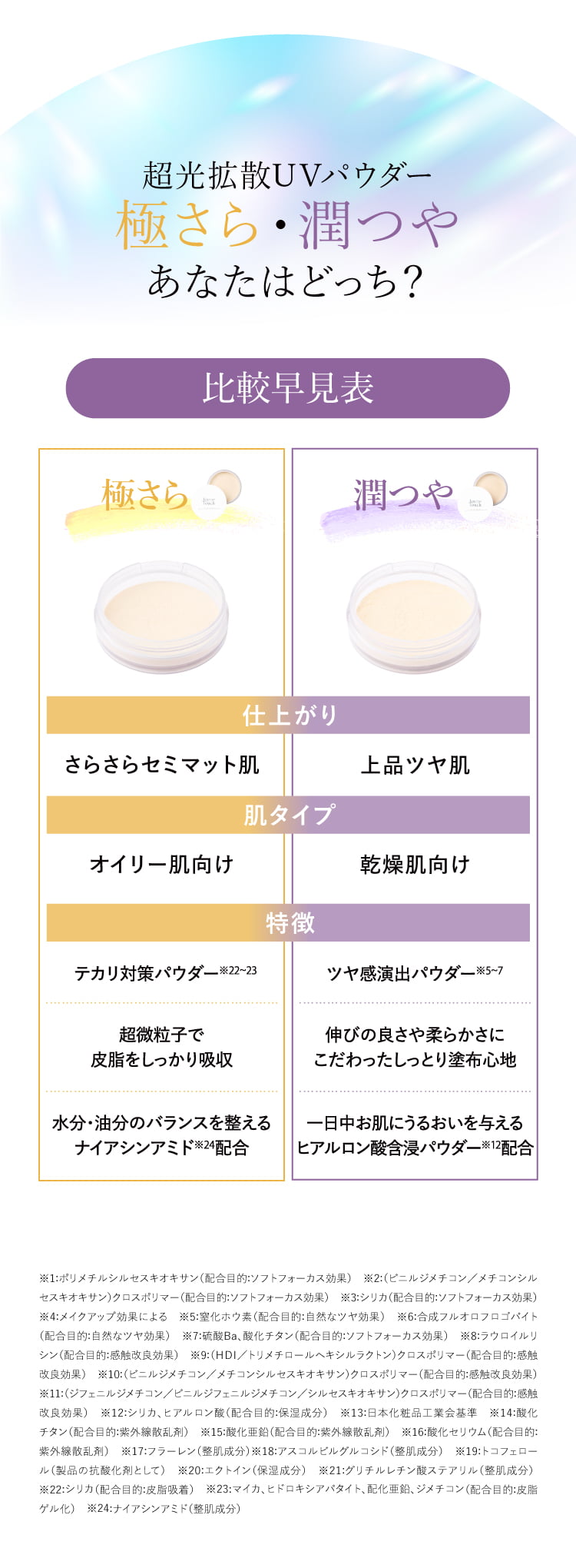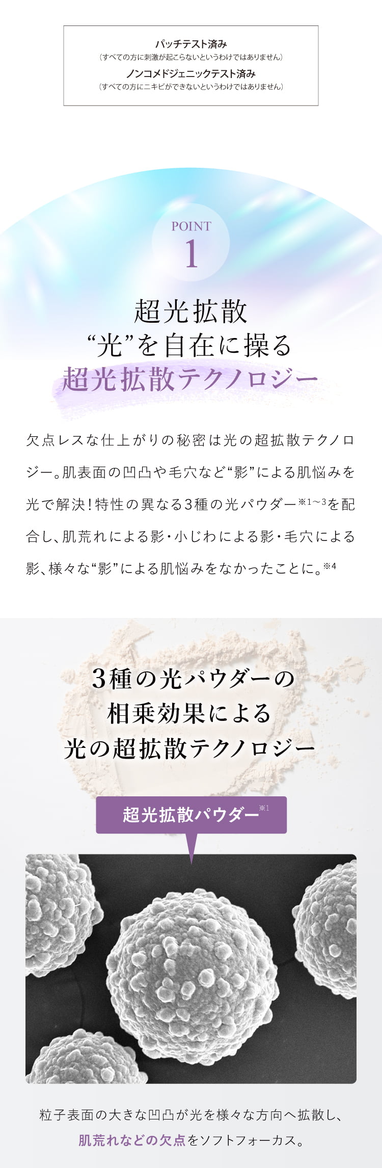 特徴 超光拡散テクノロジーで、欠点レスな上品ツヤ肌へ導くフィニッシングパウダー。 欠点レスな仕上がり、皮脂対策、豊富な美容成分、ノンケミカル処方と、高い紫外線防御力(SPF50+ PA++++)すべてを兼ね備えるパウダーが実現しました。