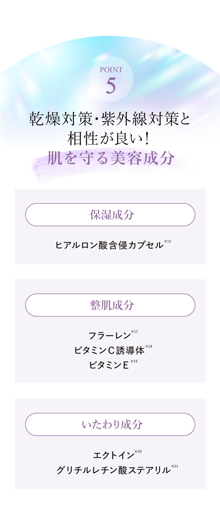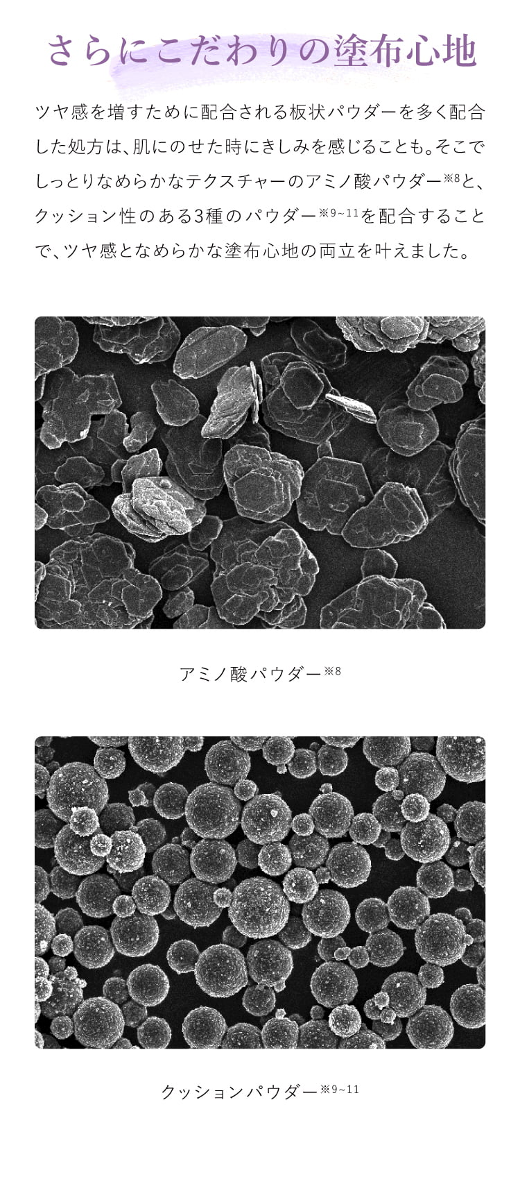 成分 (HDI/トリメチロールヘキシルラクトン)クロスポリマー、(ビニルジメチコン/メチコンシルセスキオキサン)クロスポリマー、ラウロイルリシン、合成フルオロフロゴパイト、ミリスチン酸亜鉛、窒化ホウ素、酸化亜鉛、硫酸Ba、オクチルドデカノール、ジエチルヘキサン酸ネオペンチルグリコール、ジフェニルシロキシフェニルトリメチコン、ステアリン酸、ヒアルロン酸Na、フラーレン、グリチルレチン酸ステアリル、エクトイン、アスコルビルグルコシド、トコフェロール、酸化セリウム、ヒドロキシアパタイト、リンゴ酸ジイソステアリル、シリカ、水、マイカ、アルミナ、ポリメチルシルセスキオキサン、ジメチコン、(ジフェニルジメチコン/ビニルジフェニルジメチコン/シルセスキオキサン)クロスポリマー、ハイドロゲンジメチコン、メタリン酸Na、クロルフェネシン、タルク、酸化チタン、酸化鉄