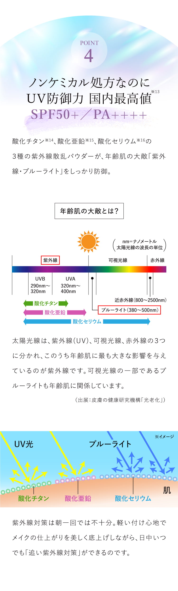 皮脂バランスを整えながら、美容成分を豊富に配合することで、乾燥しやすい日中の肌にもやさしくフィット。SPF50+ PA++++の高い紫外線防御力を備えつつ、紫外線吸収剤不使用のノンケミカル処方で、肌への負担にも配慮しています。