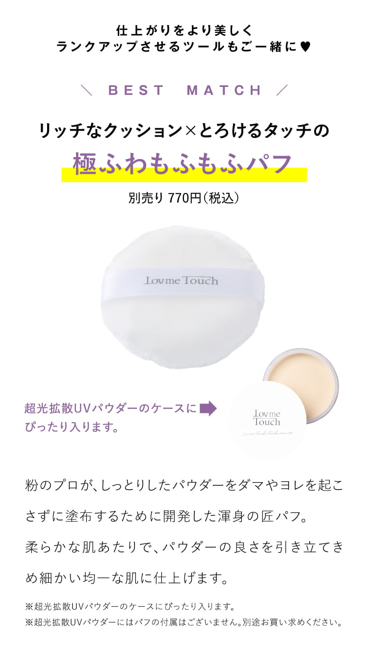 Lov me Touch(ラブミータッチ)超光拡散UVパウダー 潤つや SPF50+ PA++++は、透明感と上品なツヤを演出しながら紫外線対策も叶える高機能フィニッシングパウダーです。 独自の超光拡散テクノロジーにより、毛穴や色ムラなどの肌悩みを自然にぼかし、内側から発光するような欠点レスなツヤ肌へ導きます。