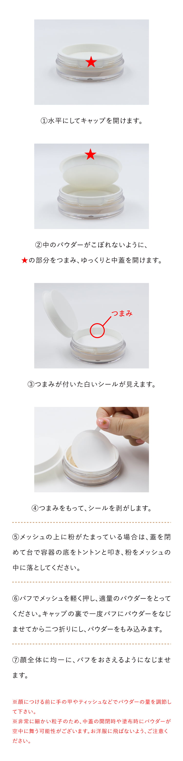 ご使用方法 パフでメッシュを軽く押し、適量のパウダーをとってください。顔につける前に手の甲やティッシュなどでパウダーの量を調節して下さい。パフを二つ折りにし、パウダーをもみ込みます。顔全体に均一に軽く滑らせるようになじませます。※ご使用前にメッシュに貼られているシールをはがしてください。※ご使用後は中のフタをしっかり閉めてください。