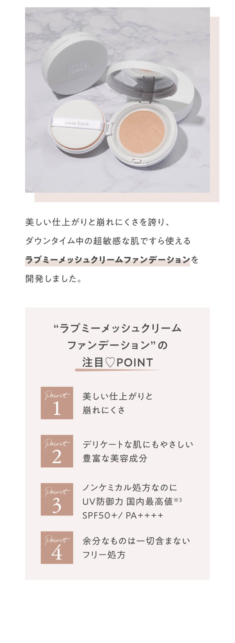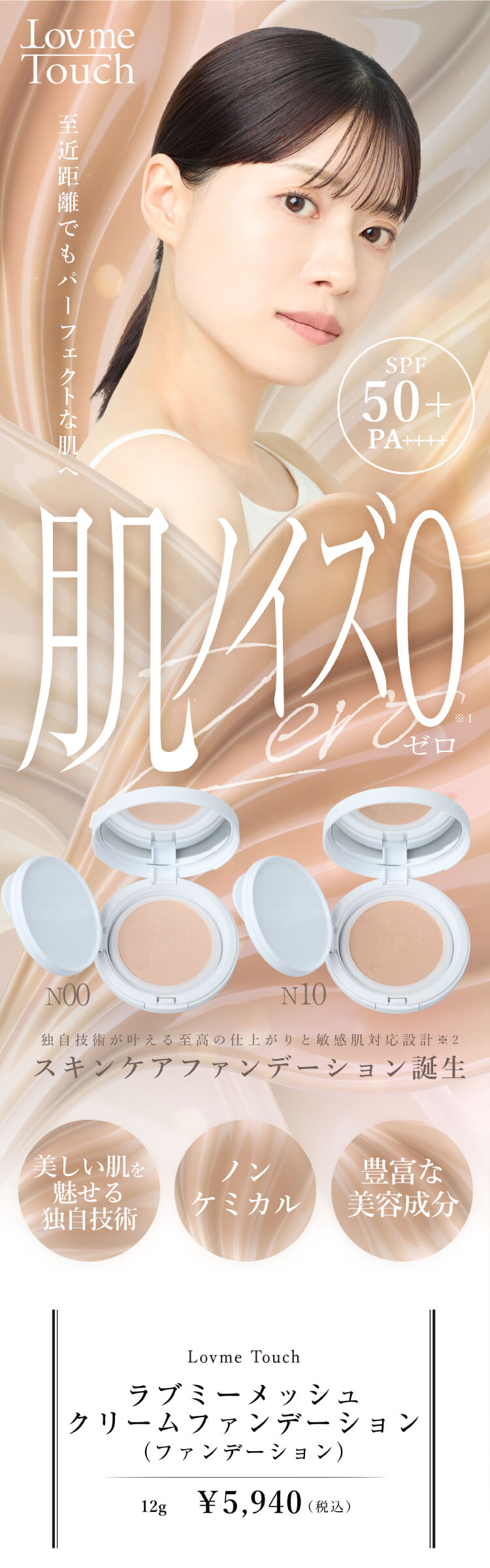Lov me Touch(ラブミータッチ)ラブミーメッシュクリームファンデーション SPF50+ PA++++**は、仕上がりの美しさと敏感肌へのやさしさを両立したスキンケア発想のファンデーションです。 独自のメッシュ構造テクノロジーにより、ムラになりにくく均一に密着し、薄づきでありながら高いカバー力を実現。毛穴や色ムラを自然に補整し、至近距離でも自信の持てる肌印象へ導きます。