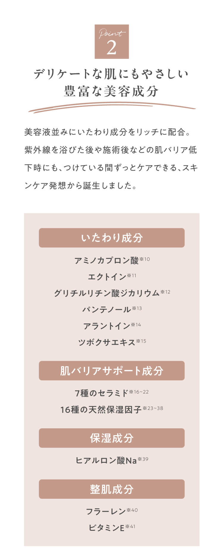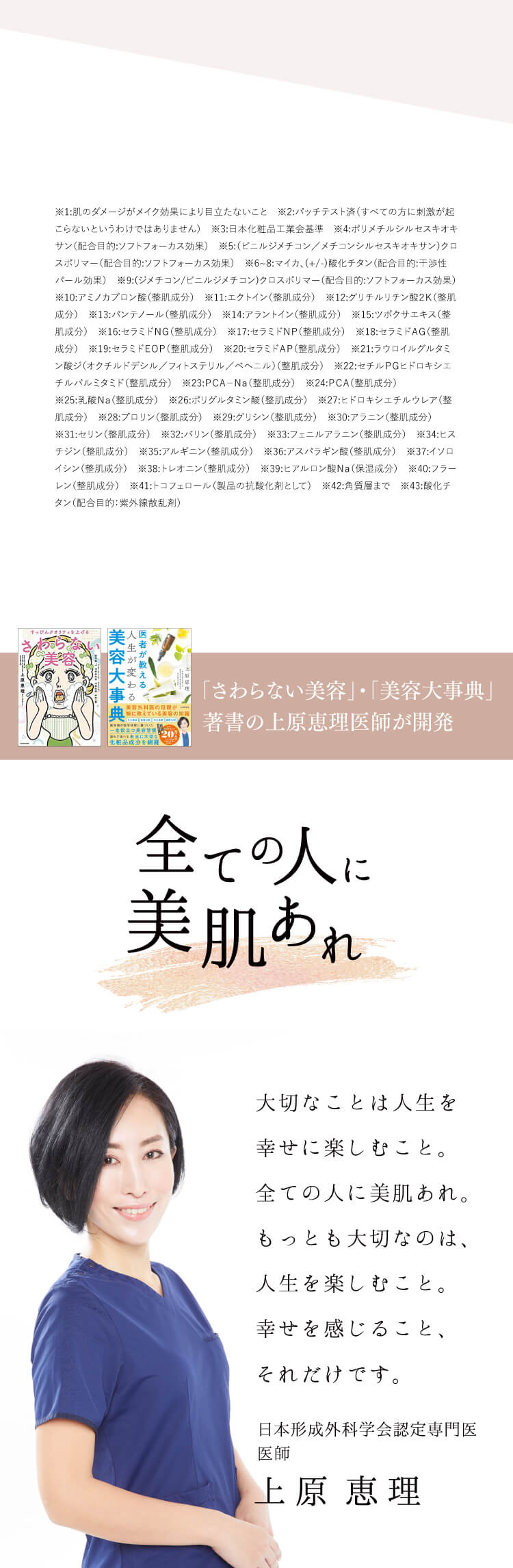 成分 水、シクロペンタシロキサン、ジフェニルシロキシフェニルトリメチコン、トリエチルヘキサノイン、BG、ジメチコン、PEG-9ポリジメチルシロキシエチルジメチコン、ペンチレングリコール、ポリメチルシルセスキオキサン、グリセリン、ジステアルジモニウムヘクトライト、セチルPEG/PPG-10/1ジメチコン、アミノカプロン酸、ツボクサエキス、フラーレン、セラミドNG、セラミドNP、セラミドAG、セラミドEOP、セラミドAP、ヒアルロン酸Na、ラウロイルグルタミン酸ジ(オクチルドデシル/フィトステリル/ベヘニル)、セチルPGヒドロキシエチルパルミタミド、フィトステロールズ、PCA-Na、PCA、乳酸Na、ポリグルタミン酸、ヒドロキシエチルウレア、プロリン、グリシン、アラニン、セリン、バリン、フェニルアラニン、ヒスチジン、アルギニン、アスパラギン酸、イソロイシン、トレオニン、シア脂油、アラントイン、グリチルリチン酸2K、エクトイン、パンテノール、トコフェロール、水添レシチン、エチルヘキシルグリセリン、ステアリン酸、トリメチルシロキシケイ酸、(ビニルジメチコン/メチコンシルセスキオキサン)クロスポリマー、(ジメチコン/ビニルジメチコン)クロスポリマー、塩化Na、水酸化Al、PVP、アルミナ、マイカ、 (+/-)酸化チタン、タルク、酸化鉄