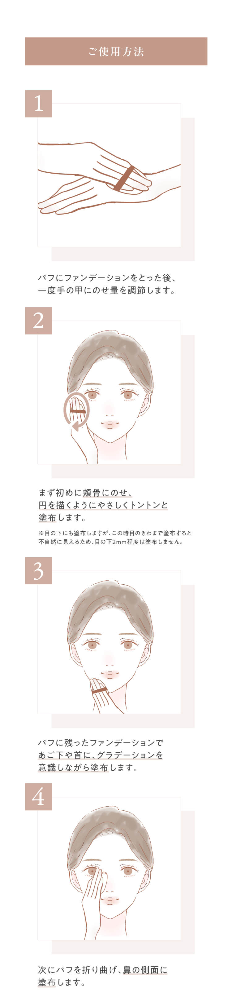 ご使用方法 付属のパフに適量をとり顔全体に軽くおさえるようにつけてください。