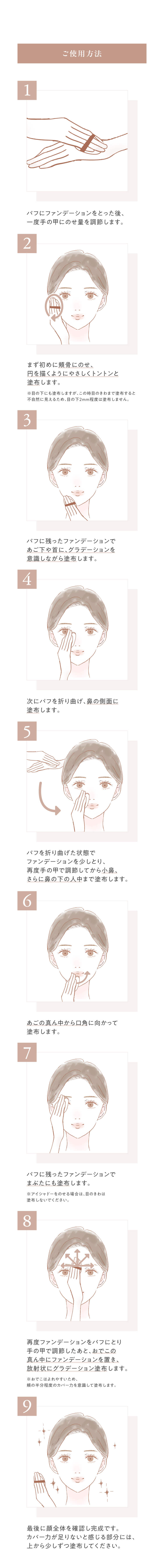ご使用方法 付属のパフに適量をとり顔全体に軽くおさえるようにつけてください。