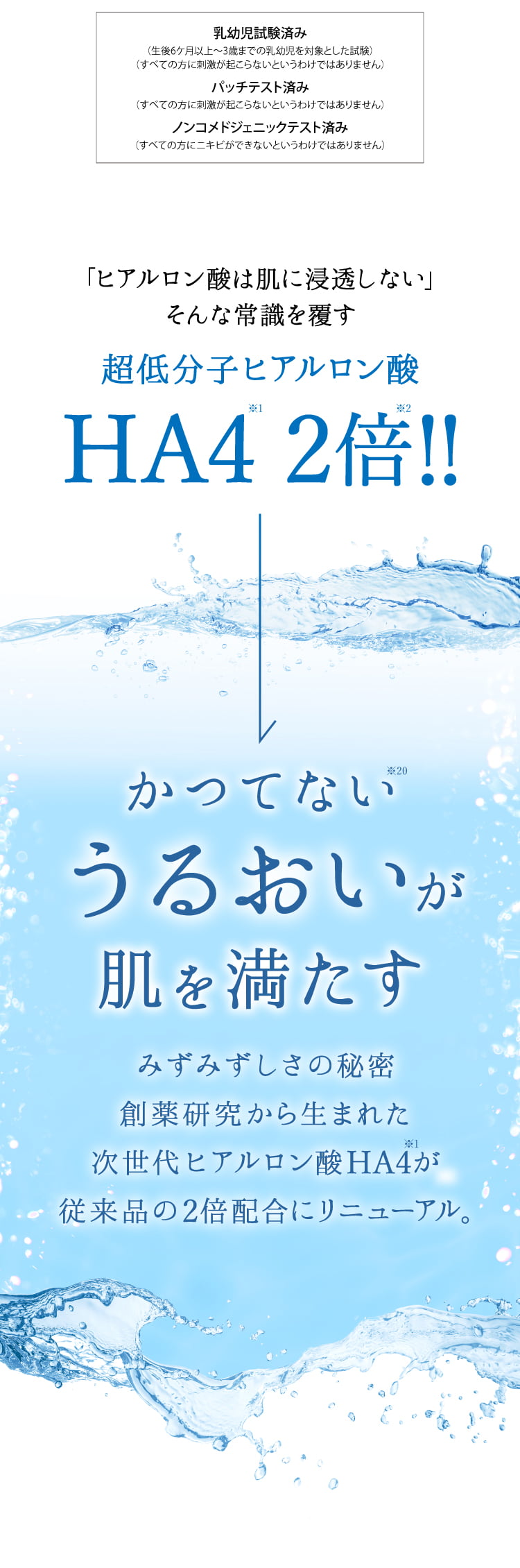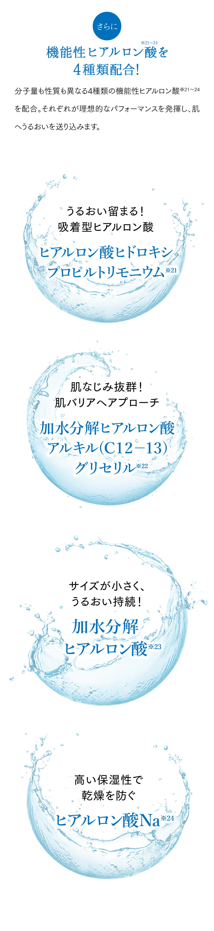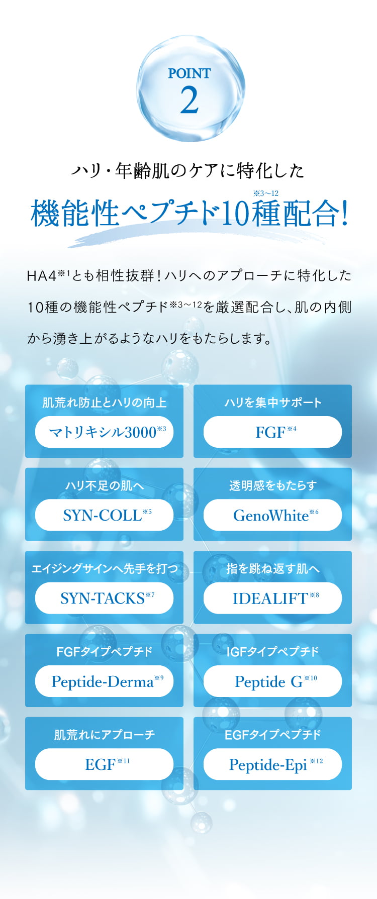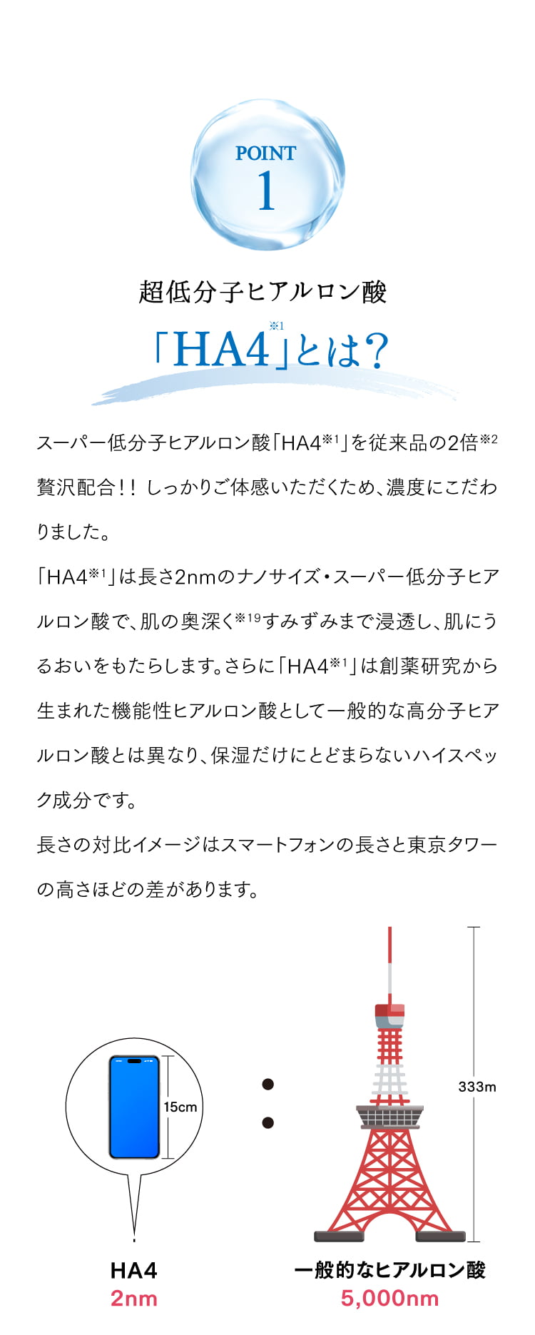特徴 「ヒアルロン酸は肌に浸透しない」そんな常識を覆す、スーパー低分子ヒアルロン酸HA4を従来品の2倍配合。さらにハリ・年齢肌のケアに特化した機能性ペプチド10種や、うるおいを抱えて逃さない肌へ導く5種のヒト型セラミドも新たに配合。