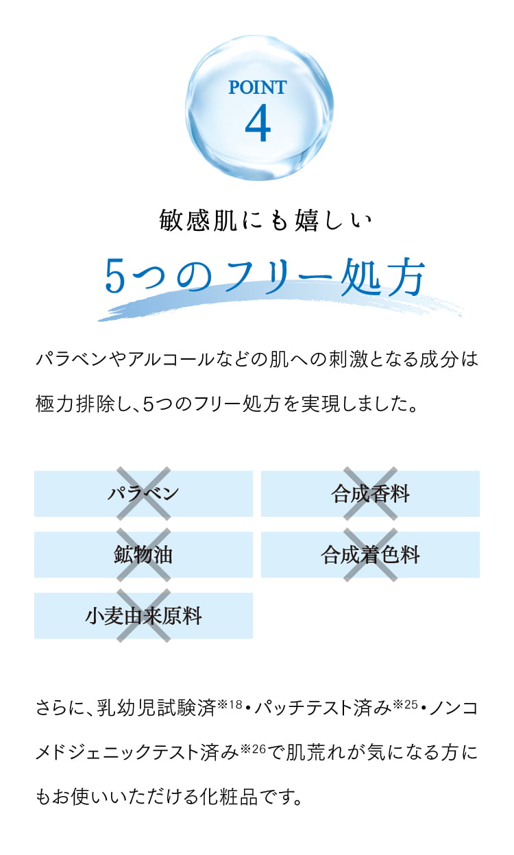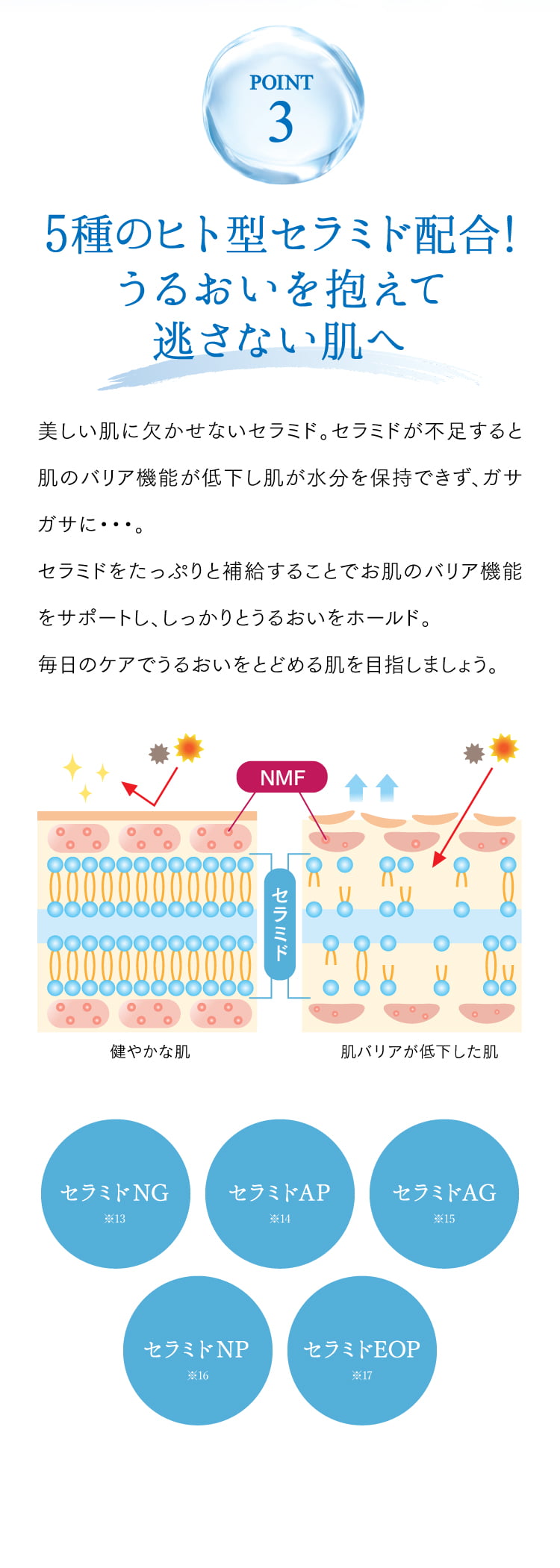 独自のスーパー低分子ヒアルロン酸HA4を、従来品の2倍配合。角質層のすみずみまでうるおいを届け、乾燥による小ジワやごわつきにアプローチします。 さらに、ハリ・年齢肌ケアに特化した機能性ペプチド10種と、うるおいを抱え込み逃がさない5種のヒト型セラミドを新配合し、保湿力と肌密度ケアを同時に強化しました。
