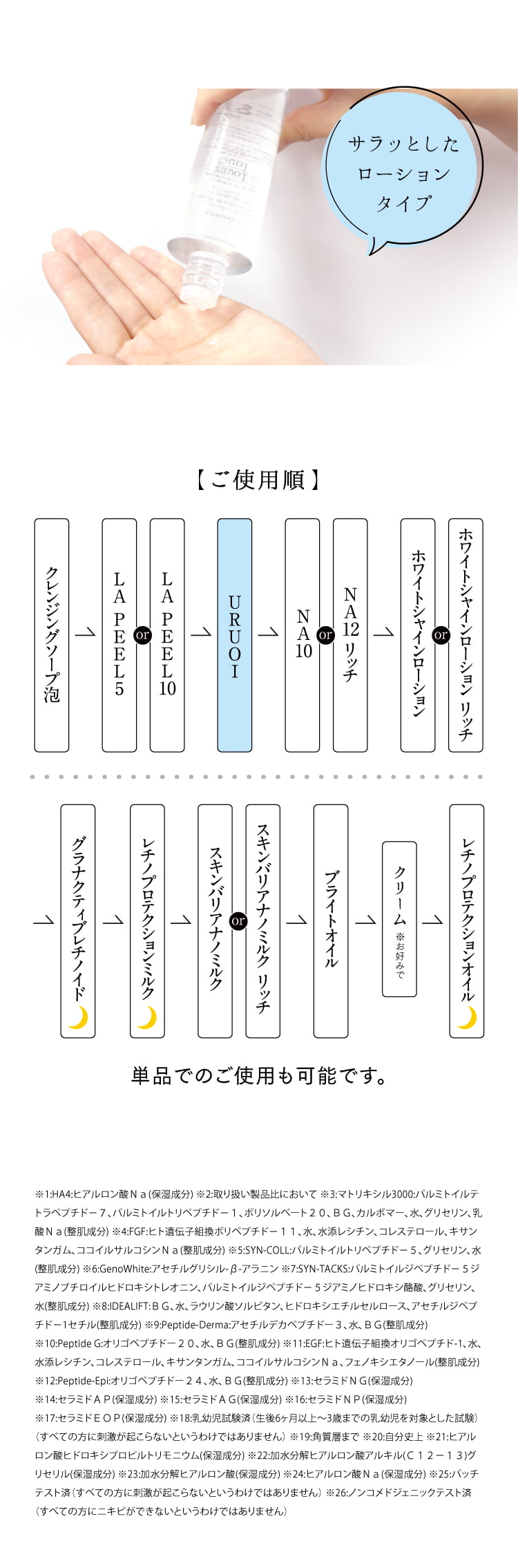 みずみずしくなじむ心地よい使用感で、肌の土台をしっかり整え、うるおいに満ちたクリアな肌印象へ。 毎日のスキンケアに取り入れやすい、**大幅にパワーアップした“URUOI”**です。
