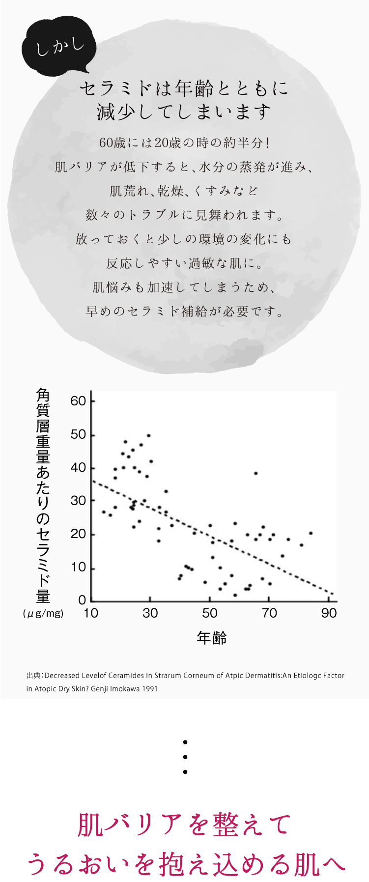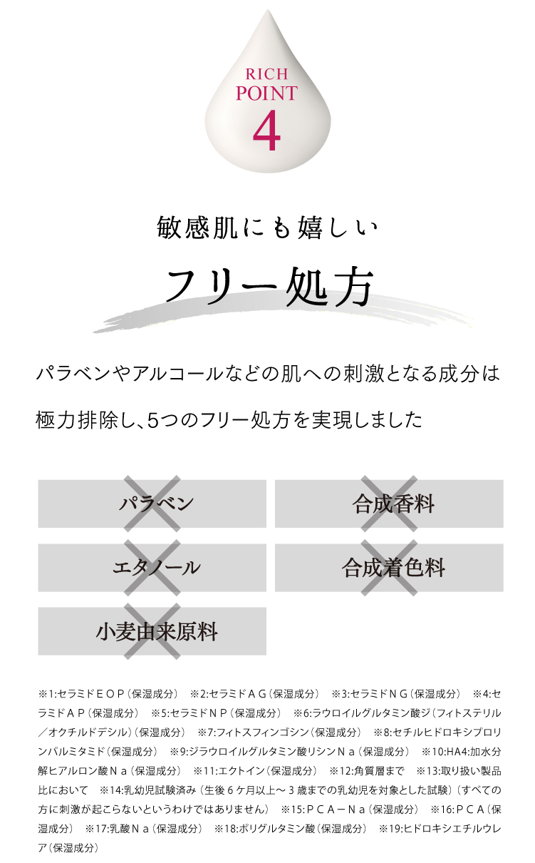 保湿効果に優れたヒト型セラミドを従来品の1.5倍、15%以上配合。 さらに、話題のスーパー低分子ヒアルロン酸HA4と、 水分を抱え込み逃がさない貯水成分エクトインを贅沢に配合し、 乾燥しやすい肌を内側からうるおいで満たします。