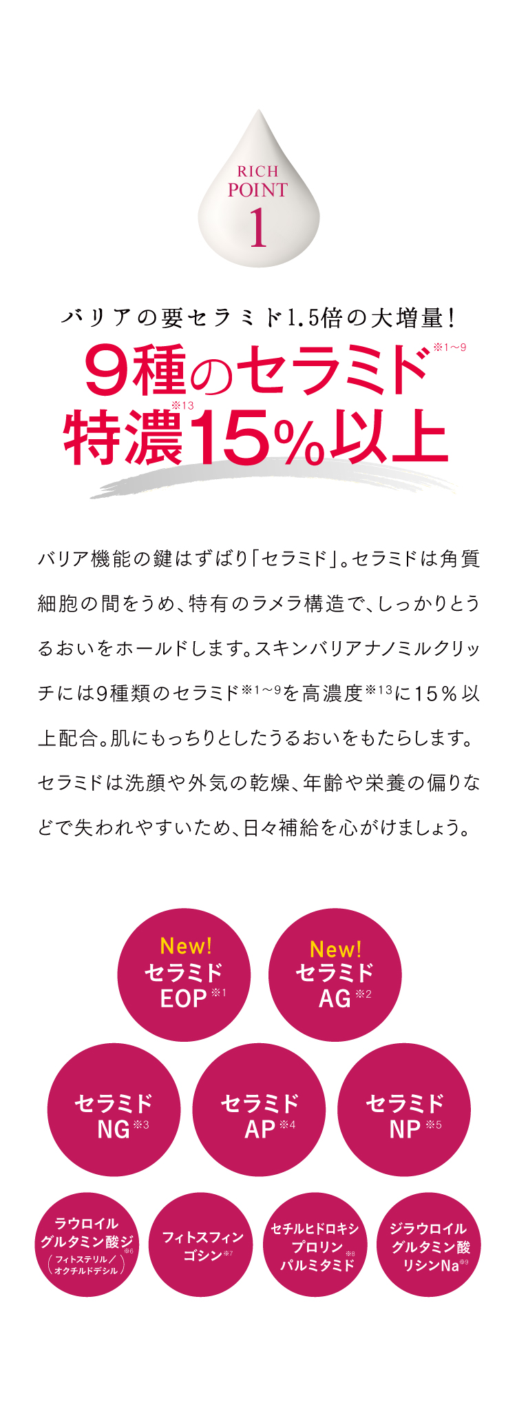 ※1 セラミドEOP、セラミドAG、セラミドNG、セラミドAP、セラミドNP、ラウロイルグルタミン酸ジ(フィトステリル/オクチドデシル)、フィトスフィンゴシン、セチルヒドロキシプロリンパルミタミド、ジラウロイルグルタミン酸リシンNa(整肌成分)