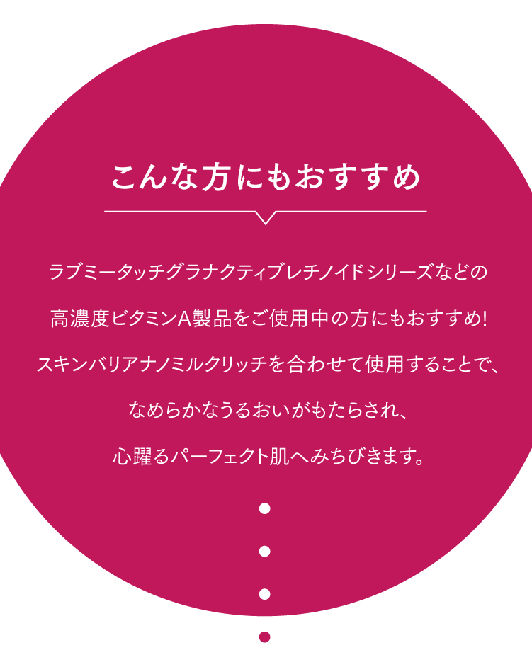 朝晩のスキンケアはもちろん、 メイクの上からのうるおい補給にも使用可能。 24時間、乾燥にゆらがない健やかな肌へ導きます。