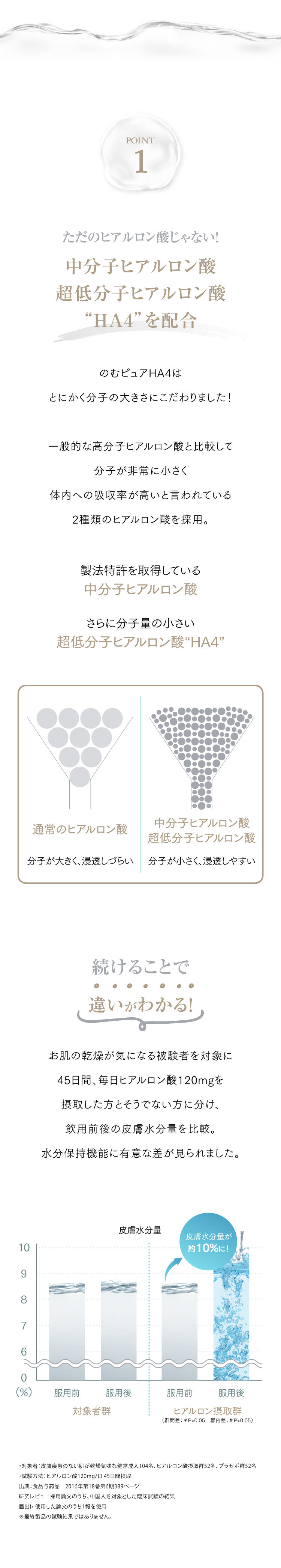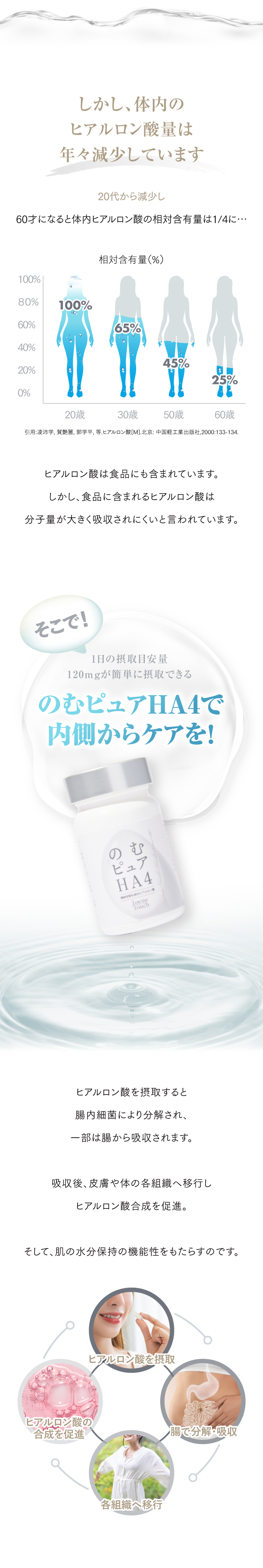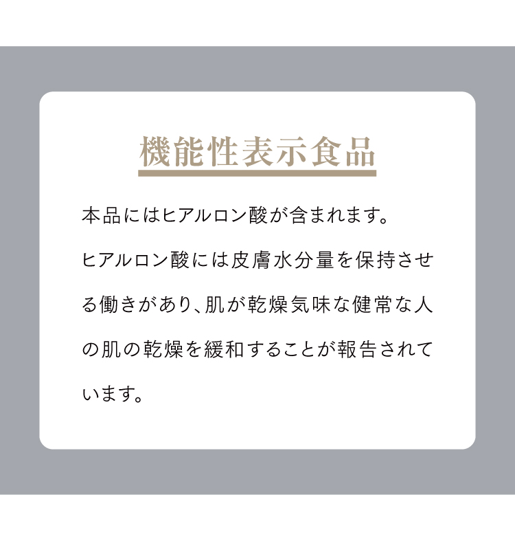肌のうるおいに欠かせない**スーパー低分子ヒアルロン酸「HA4」**を配合し、 毎日のインナーケアで、乾燥しがちな肌を内側からサポートします。