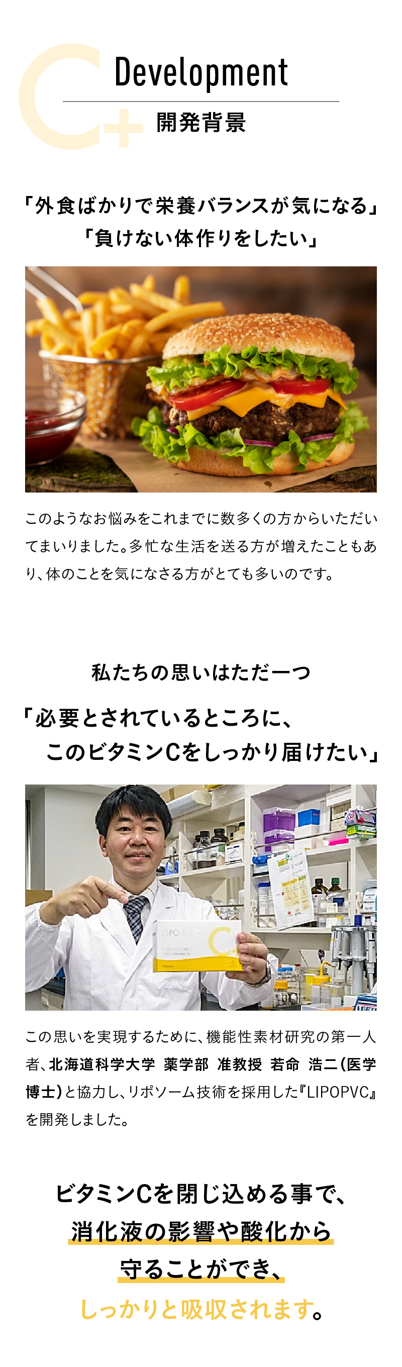 この問題を解決したのが『LIPO P VC』です。『LIPO P VC』の大きな特徴は、ビタミンCを特殊な技術でリポソーム化していること。リポソームとは人の細胞と同じ、リン脂質からできた膜のことです。この膜でビタミンCを包んであげることで、ビタミンCは大きく生まれ変わりました。