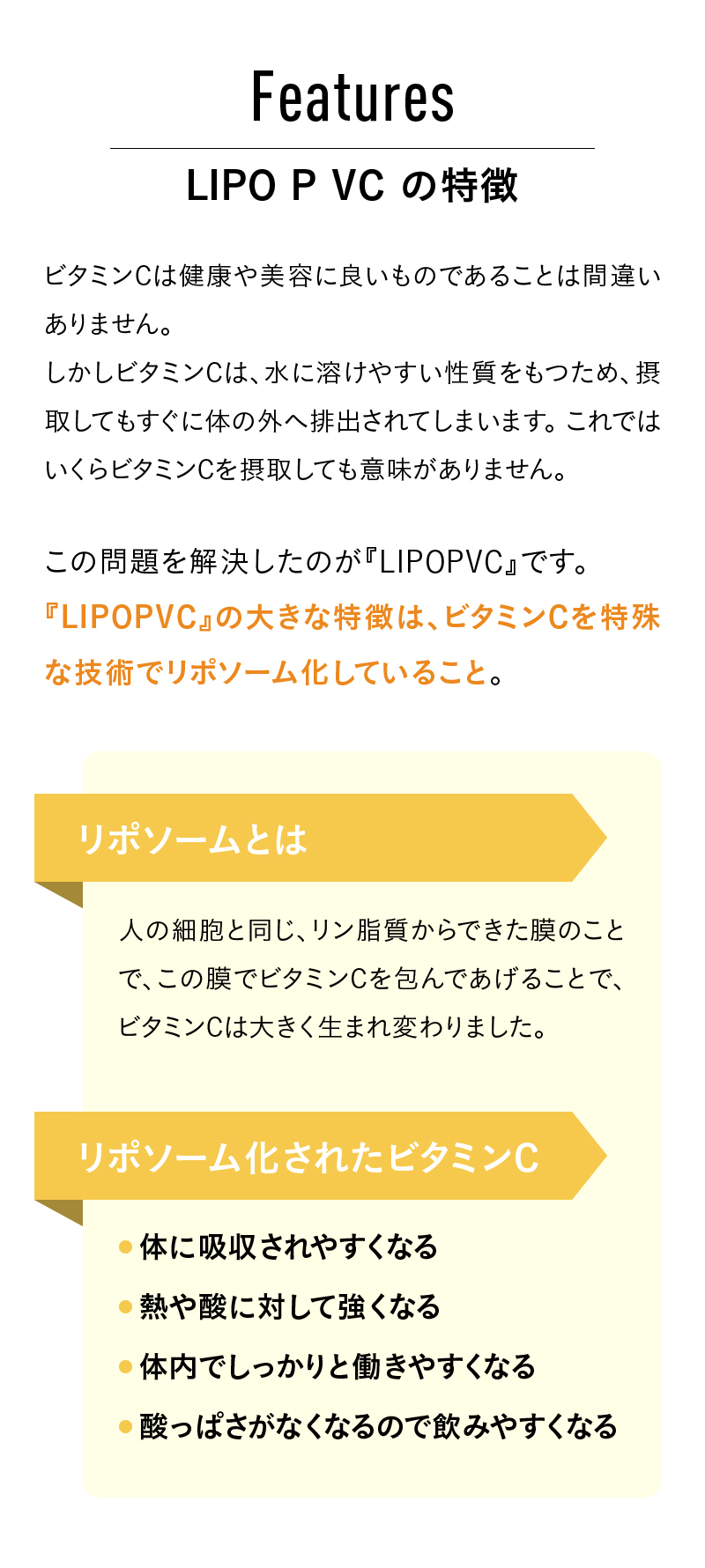 特徴 ビタミンCは健康や美容に良いものであることは間違いありません。しかしビタミンCは、水に溶けやすい性質をもつため、摂取してもすぐに体の外へ排出されてしまいます。これではいくらビタミンCを摂取しても意味がありません。