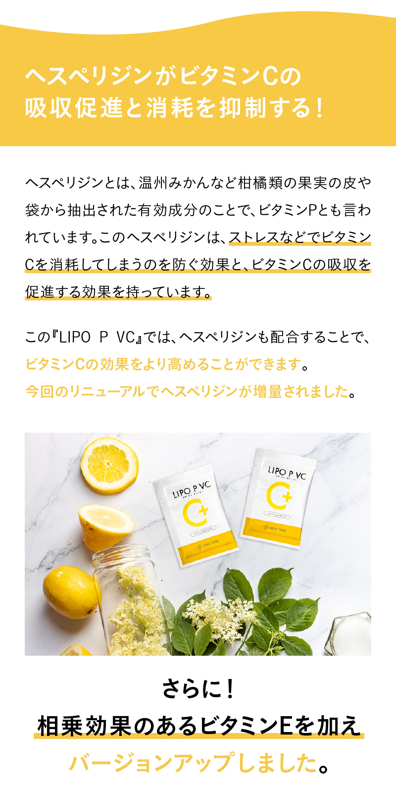 リポソーム化ビタミンCに加え、吸収をサポートするヘスペリジン(ビタミンP)と抗酸化作用を持つビタミンEを配合した高機能サプリメント。1包あたりビタミンC1000mgで、美容や健康をサポートします。
