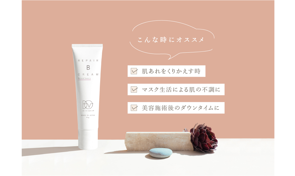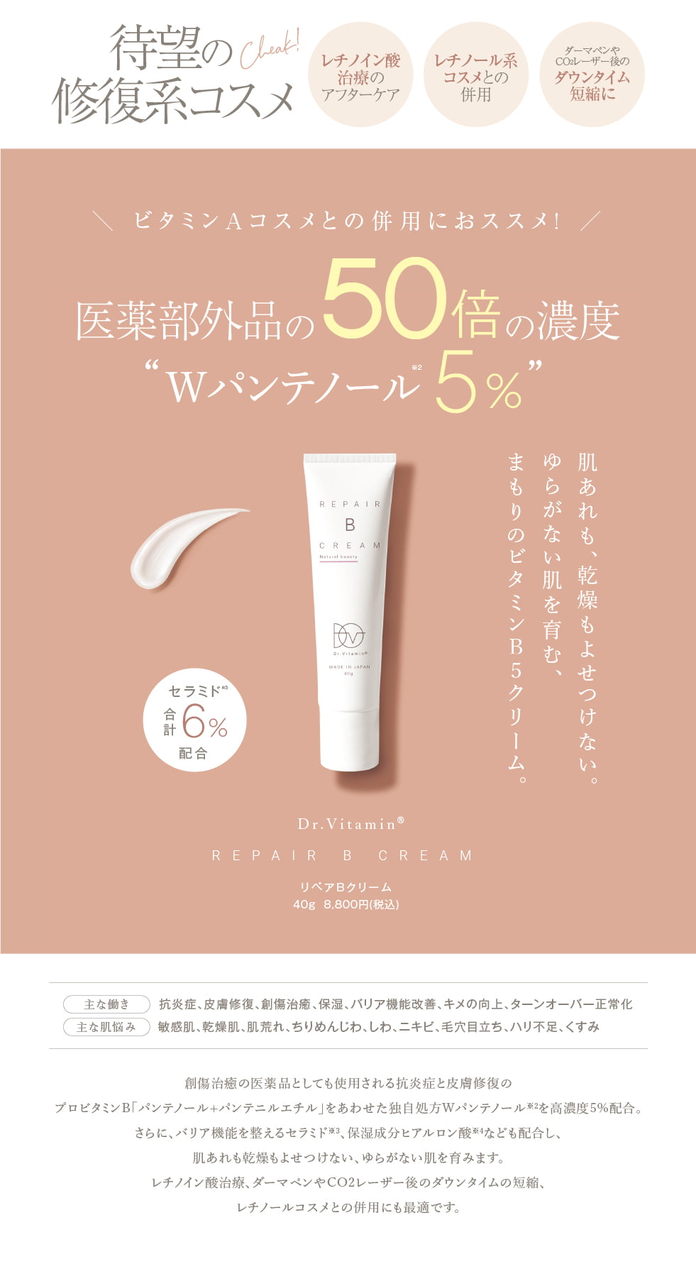 Dr.Vitamin(ドクタービタミン) Repair B Cream リペア B クリーム 40gは、肌あれや乾燥を繰り返しがちな敏感な肌を「守り、育てる」ことに着目して開発された高保湿クリームです。