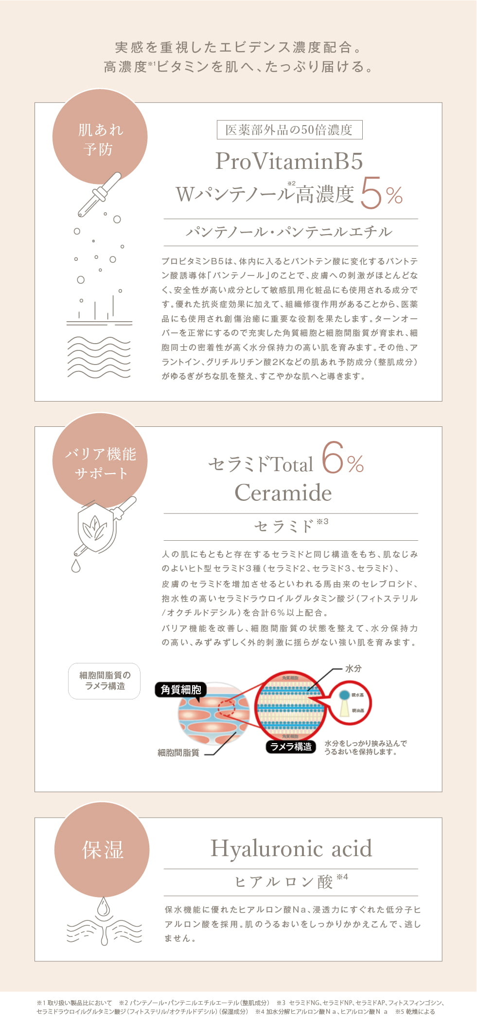 ※1 取り扱い製品比において ※2 パンテノール・パンテニルエチル(整肌成分) ※3 セラミドNG、セラミド NP、セラミドAP、フィトスフィンゴシン ※4 加水分解ヒアルロン酸Na、ヒアルロン酸Na※5 乾燥による