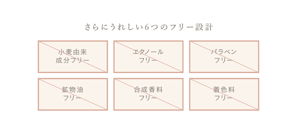 また、小麦由来成分・エタノール・パラベン・鉱物油・合成香料・着色料を使用しない6つのフリー処方で、敏感肌の方にも配慮。肌あれを繰り返す時期やマスク生活による不調時、美容施術後のダウンタイムにも使いやすい設計です。