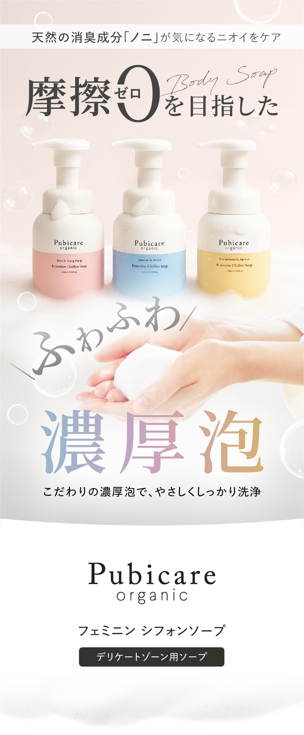 Pubicare organic(ピュビケアオーガニック)フェミニンシフォンソープ 220mL は、デリケートゾーンのために「摩擦ゼロ」を目指して開発された、泡タイプのフェミニンウォッシュです。 まぶたよりも薄く繊細なデリケートゾーンをやさしく洗えるよう、きめ細かく濃厚なふわふわ泡に徹底的にこだわり、3層メッシュ構造の専用ポンプを採用。肌への摩擦を極力抑えながら、やさしくもしっかりと汚れを落とします。