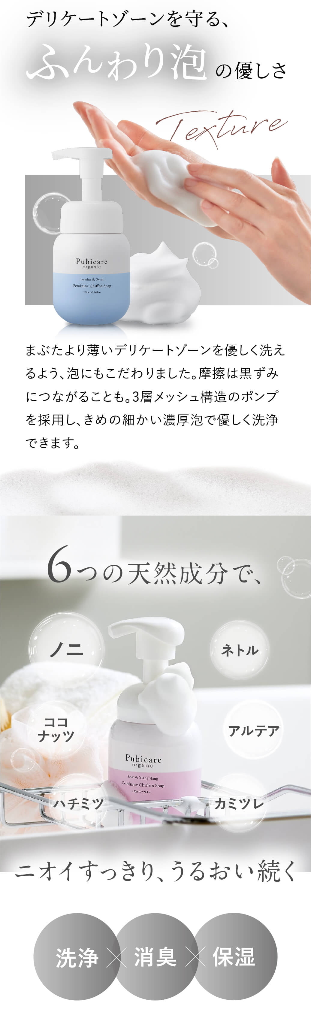 まぶたより薄いデリケートゾーンを優しく洗えるよう、泡にもこだわりました。摩擦は黒ずみにつながることも。