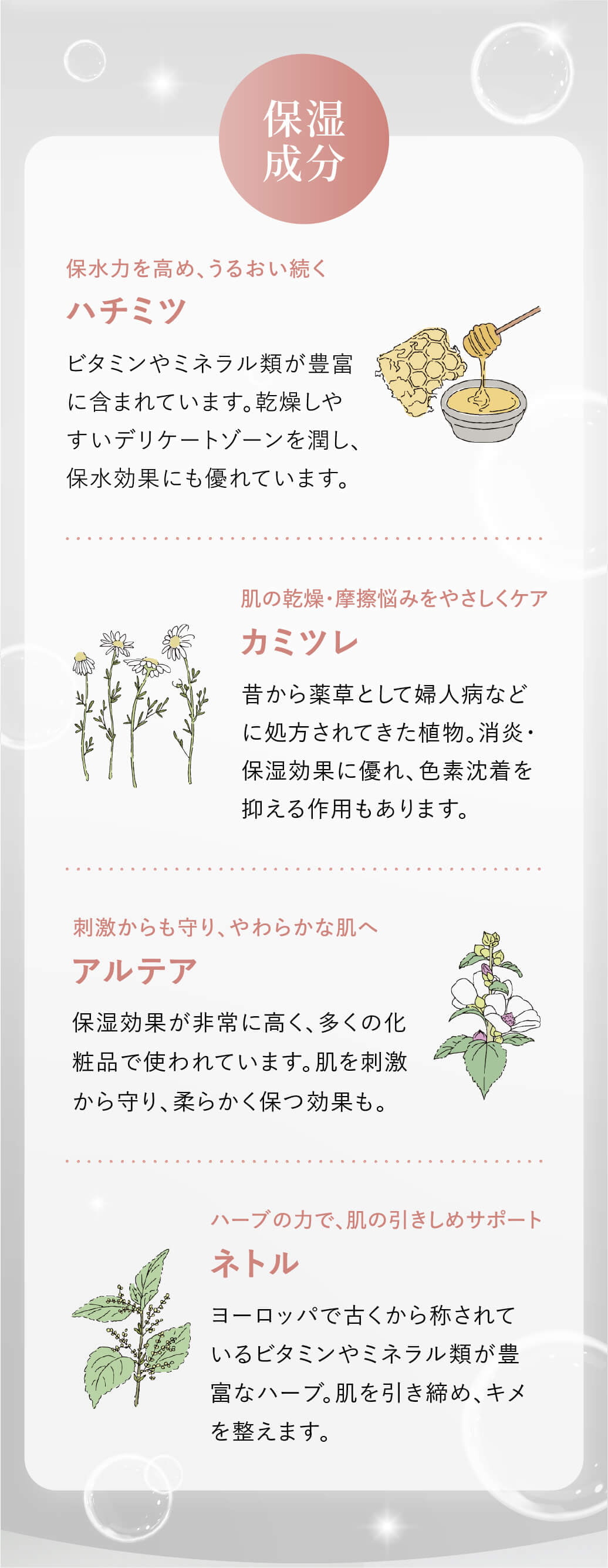 ※アロエベラ液汁、水、ヤシ油アルキルグルコシド、※香料、グリセリン、ヤエヤマアオキカルス培養溶解質、クエン酸、マルトデキストリン、※ダマスクバラ花油、※イランイラン花油、ニオイテンジクアオイ葉油、※パルマローザ油、※ジャスミン油、※ラベンダー油、※レモン果皮油、※セイロンニッケイ葉油、ホホバ種子油、※ハチミツ、アルテア根エキス、カミツレエキス、ウルチカジオイカエキス、トコフェロール、ソルビン酸K、エタノール