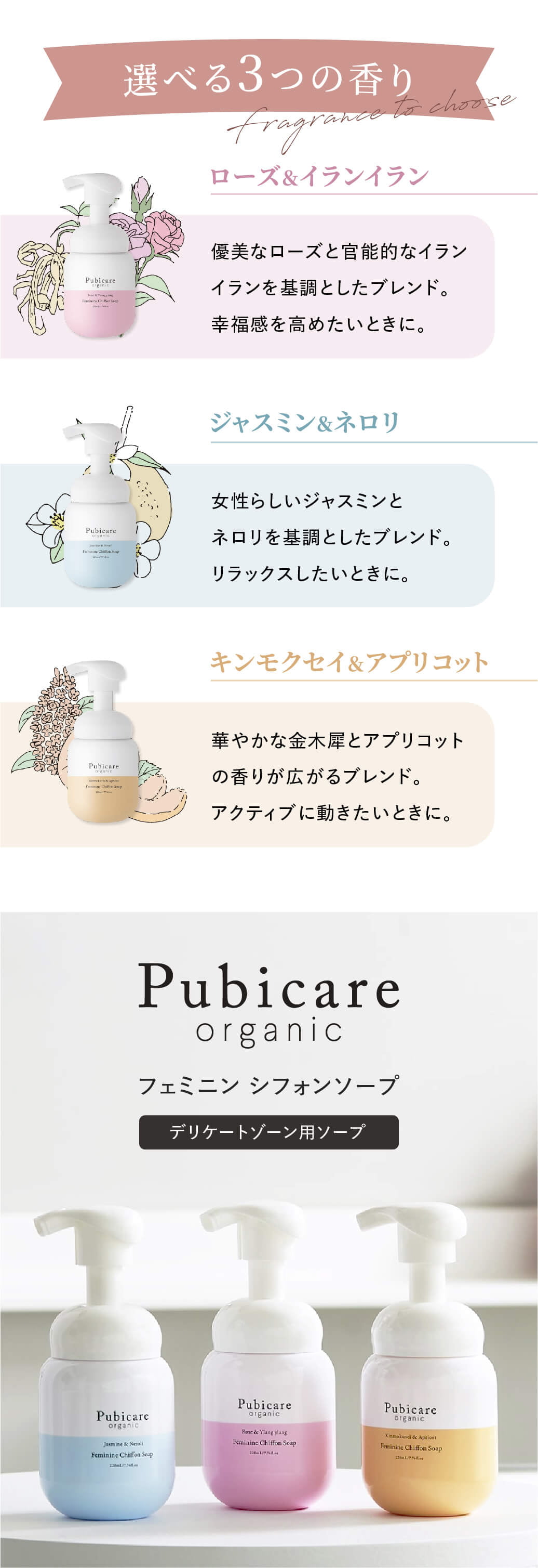 香りは気分やシーンに合わせて選べる3種類。 ローズ&イランイランは幸福感を高めたいときに、 ジャスミン&ネロリはリラックスしたいときに、 キンモクセイ&アプリコットは前向きにアクティブに過ごしたいときに。 毎日のケアタイムを、心まで満たすひとときへと導いてくれるフェミニンソープです。