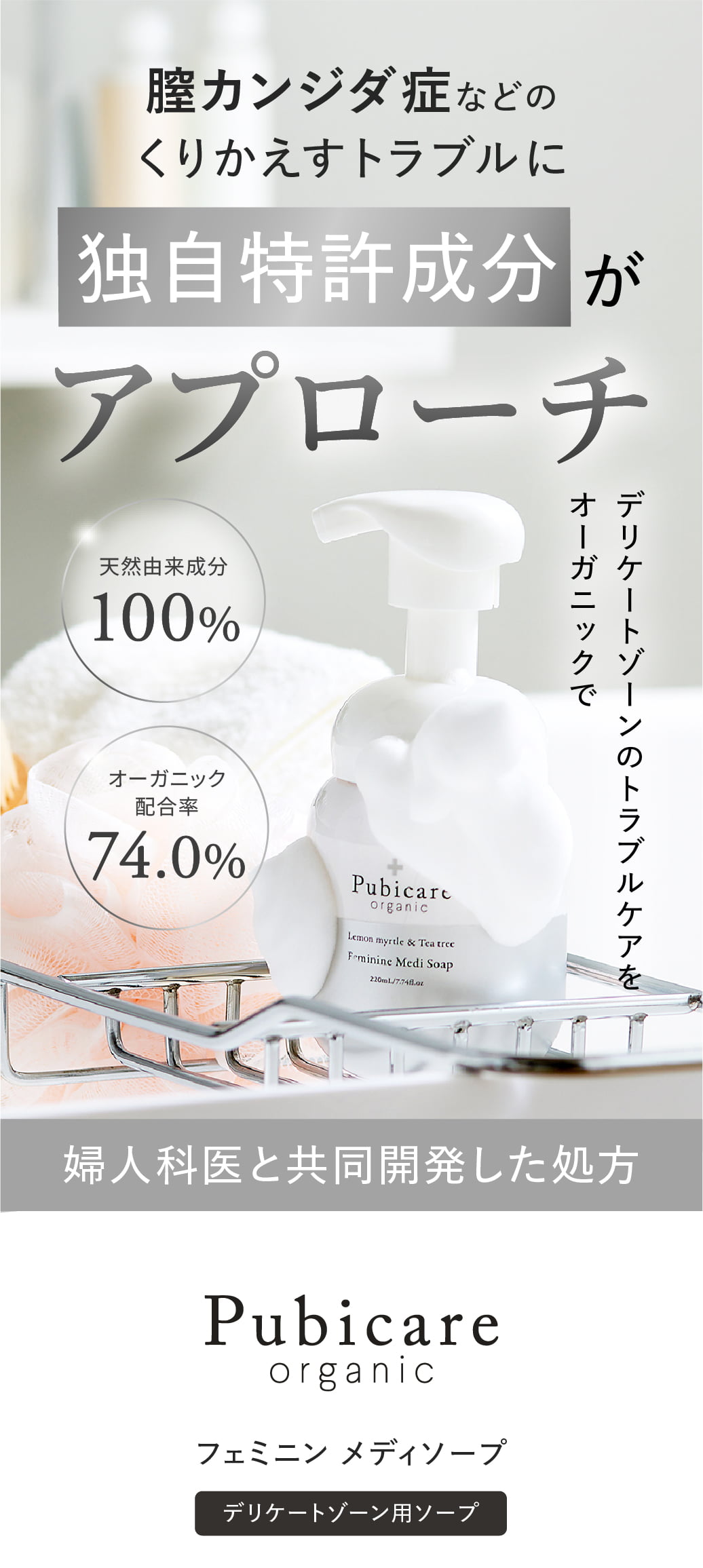 Pubicare organic(ピュビケアオーガニック)フェミニンメディソープ 220mL は、くり返しがちなデリケートゾーンのトラブルに着目し、婦人科医と共同開発されたオーガニック処方のフェミニンウォッシュです。 肌へのやさしさと機能性の両立を追求し、毎日のケアで健やかな状態へ導きます。