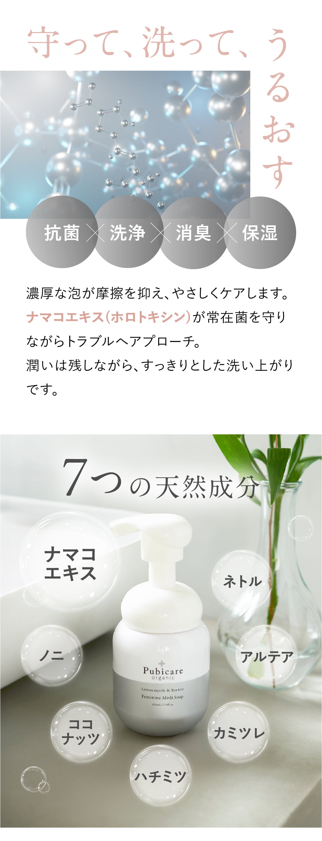 濃厚でまろやかな泡が肌への摩擦を抑えながら、繊細なデリケートゾーンを包み込むように洗浄。独自成分である**ナマコエキス(ホロトキシン)**が常在菌バランスを守りつつ、気になる不快感やトラブルにアプローチします。潤いはきちんと残しながら、洗い上がりはすっきりと清潔感のある仕上がりです。
