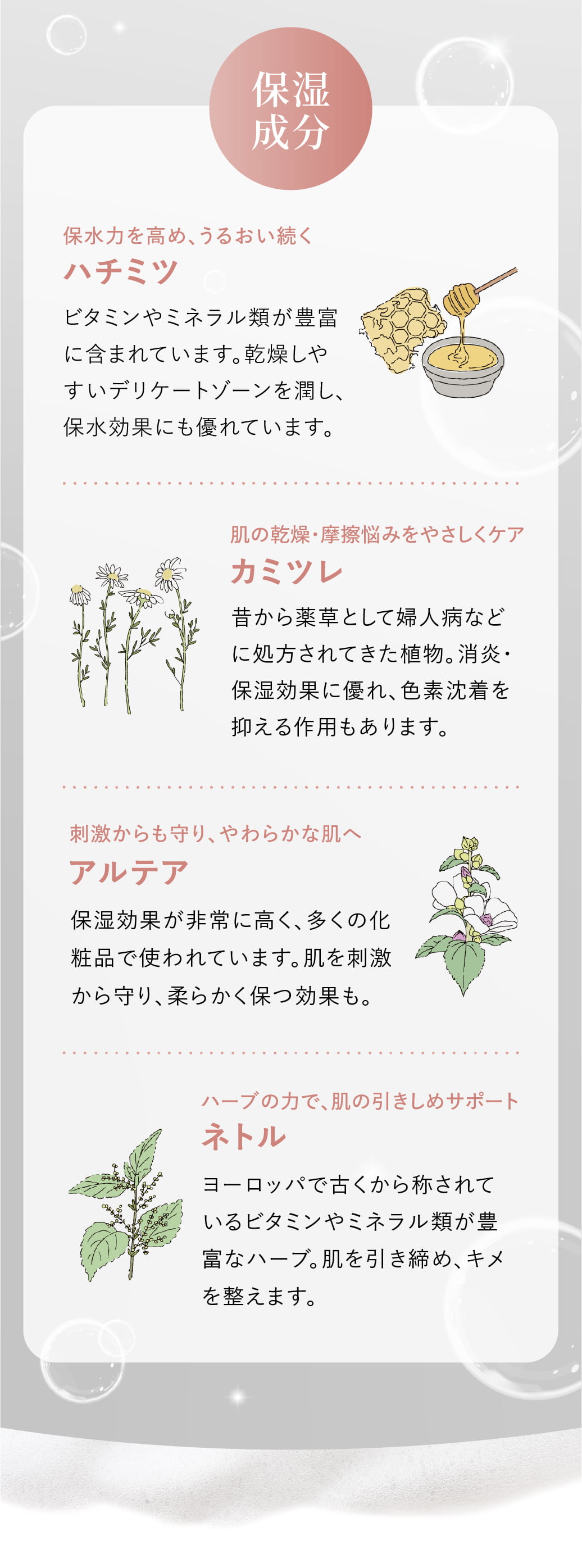 濃厚な泡が摩擦を抑え、やさしくケアします。