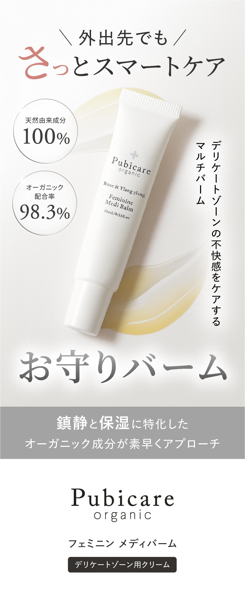 Pubicare organic(ピュビケアオーガニック)フェミニンメディバーム 15mL は、デリケートゾーンの乾燥や蒸れによる不快感をケアする、鎮静と保湿に特化したマルチバームです。オーガニック成分が素早く肌にアプローチし、ゆらぎやすい部分をやさしく守ります。