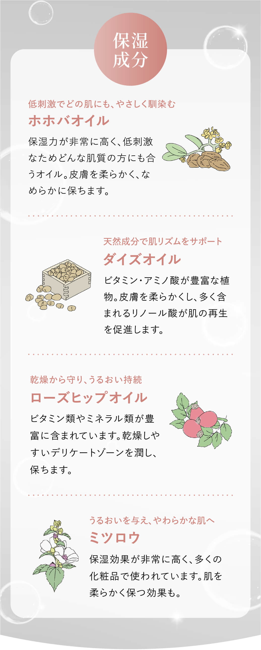 乾燥による肌荒れにはシナモンバークがすばやく働きかけ、濃厚なオイルがデリケートな肌を包み込みながら保護。繰り返しやすい不快感や、生理中のデリケートな時期のケアにも適した機能性アイテムです。
