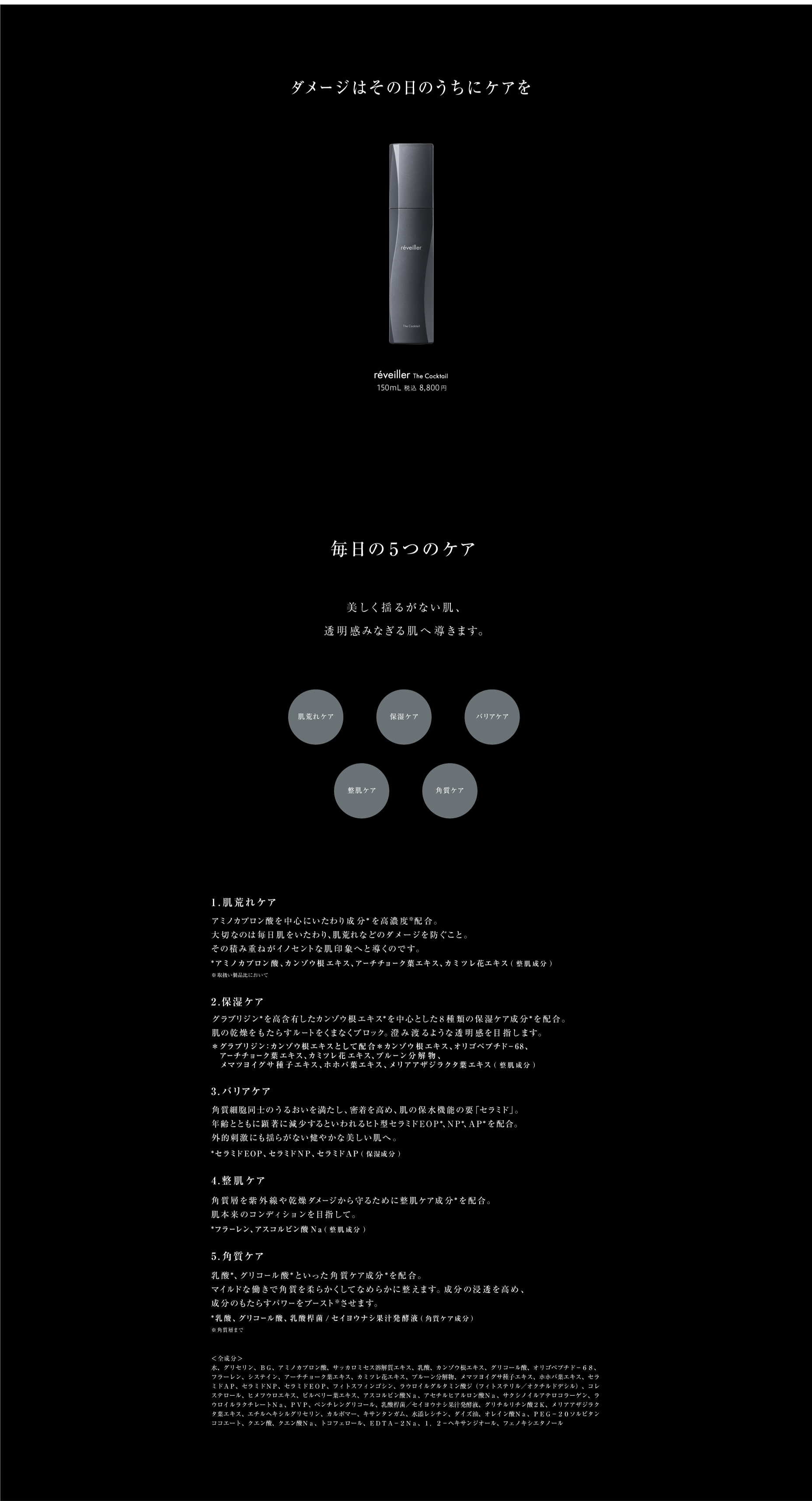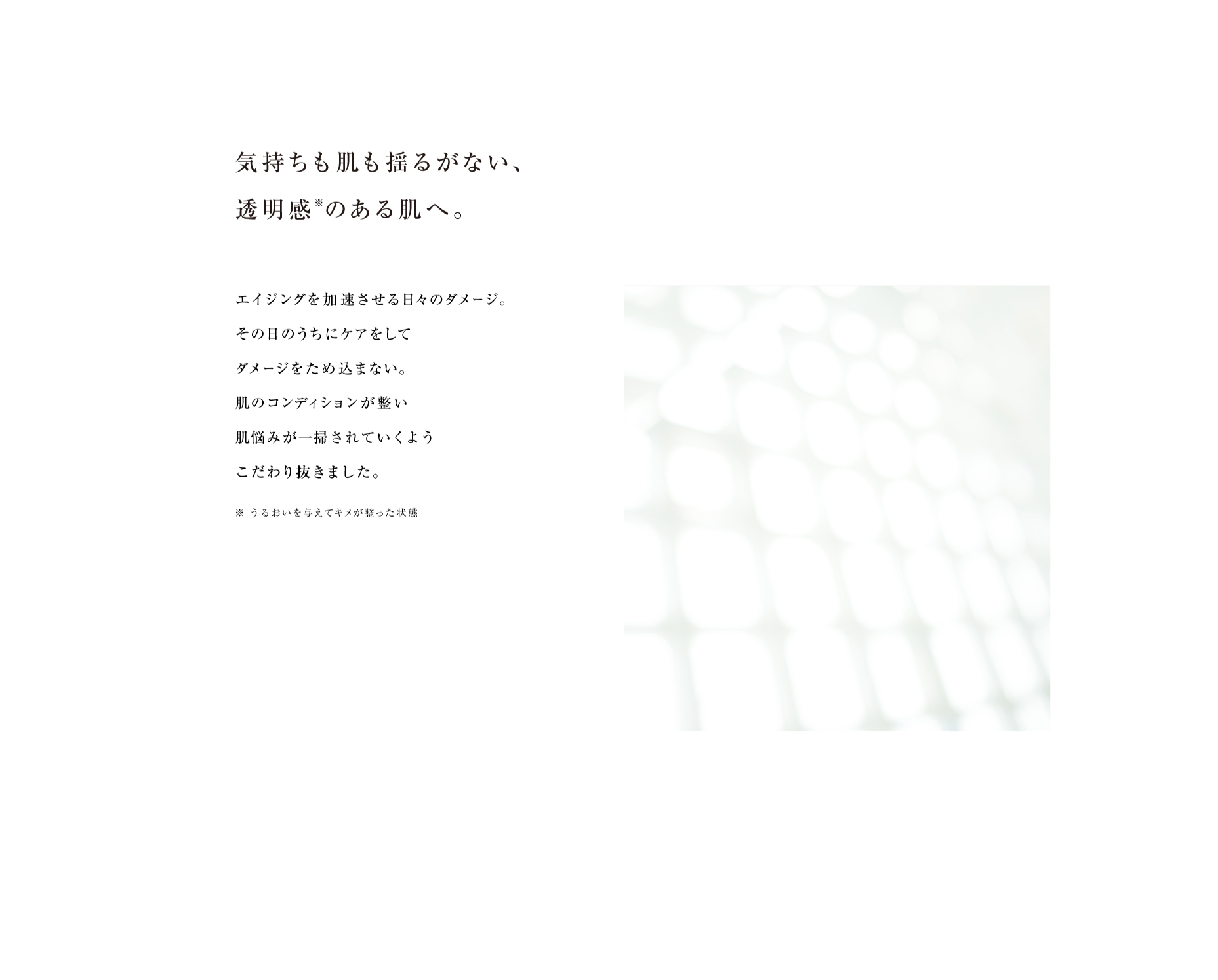 特徴 誰もが羨む無垢な肌へ、美を築く多機能化粧水。アミノカプロン酸を中心にいたわり成分を高濃度配合することで、毎日肌をいたわり、肌荒れなどのダメージを防ぎます。