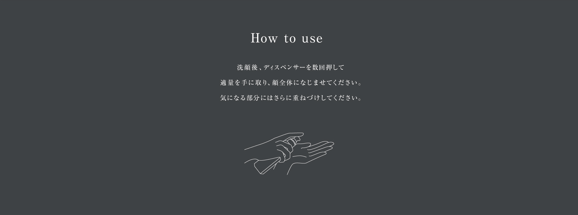 ご使用方法 洗顔後、ディスペンサーを数回押して適量を手に取り、顔全体になじませてください。気になる部分にはさらに重ねづけしてください。