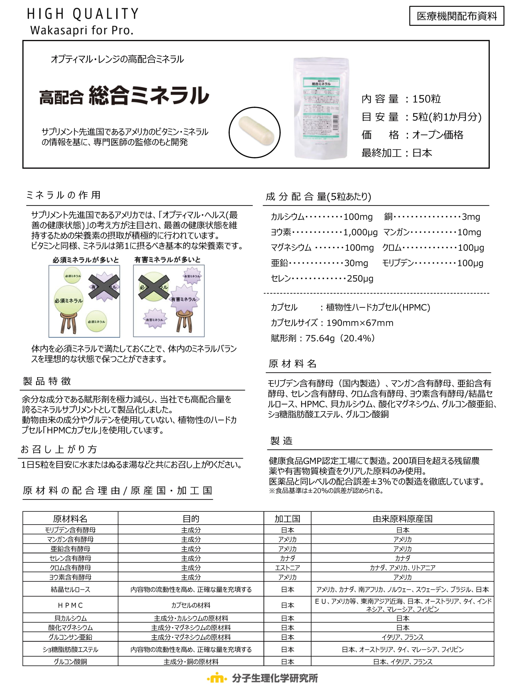 Wakasapri for Pro. 高配合総合ミネラル は、理想的な健康状態の維持をサポートするために、9種類のミネラルを高配合した総合ミネラルサプリメントです。体内で不足しがちなミネラルを効率よく補えるよう、吸収性と安全性に配慮し、酵母などの天然由来原料を採用しています。1日5粒を目安に、食事内容や体調に合わせて摂取量を調整できるため、ライフスタイルに合わせた柔軟な栄養補給が可能です。毎日のコンディション管理や、栄養バランスを意識した健康習慣に取り入れたい方におすすめの製品です。