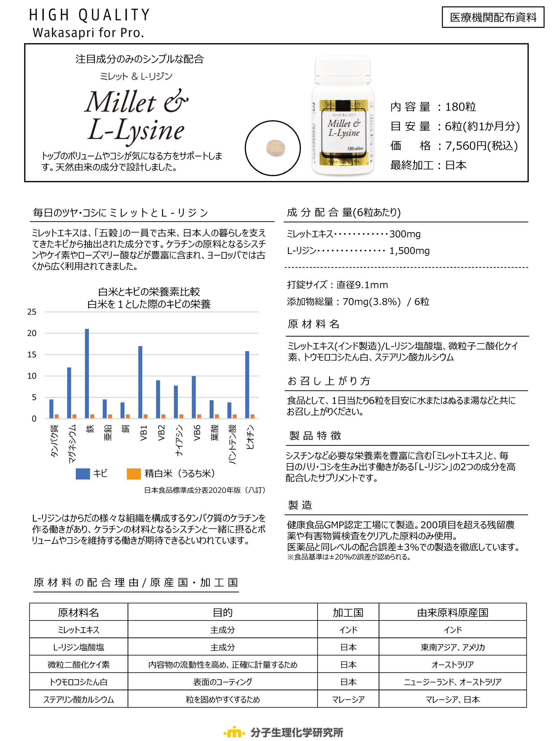 Wakasapri for Pro. ミレット&L-リジン は、女性の健やかでボリュームのある毎日をサポートするために開発されたサプリメントです。 ヨーロッパで古くから健康維持に用いられてきたミレット(キビ)を、100倍に濃縮したミレットエキスを配合。シスチンやケイ素、ローズマリー酸などを豊富に含み、内側からの美しさを支えます。 さらに、体内で合成できない必須アミノ酸であるL-リジンを組み合わせ、6粒あたりミレットエキス300mg、L-リジン1,500mgを高配合。 年齢とともに変化する女性のコンディションに寄り添い、しなやかで美しい体づくりを応援する一品です。